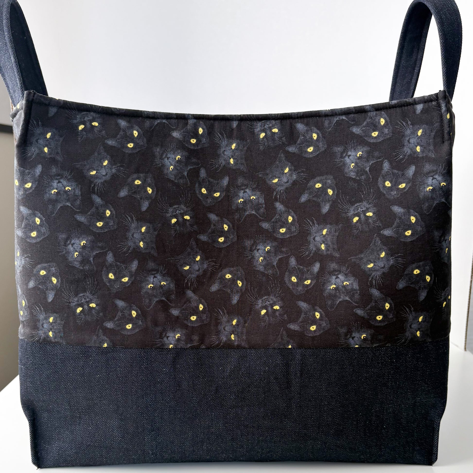 Made with denim and 100% fun quilters cotton to suit your mood. The buckets are made with double fusible fleece and stitched on edges to keep it upright. Place your project bags inside like a file system to have easy access to your organized projects with a little design flare.