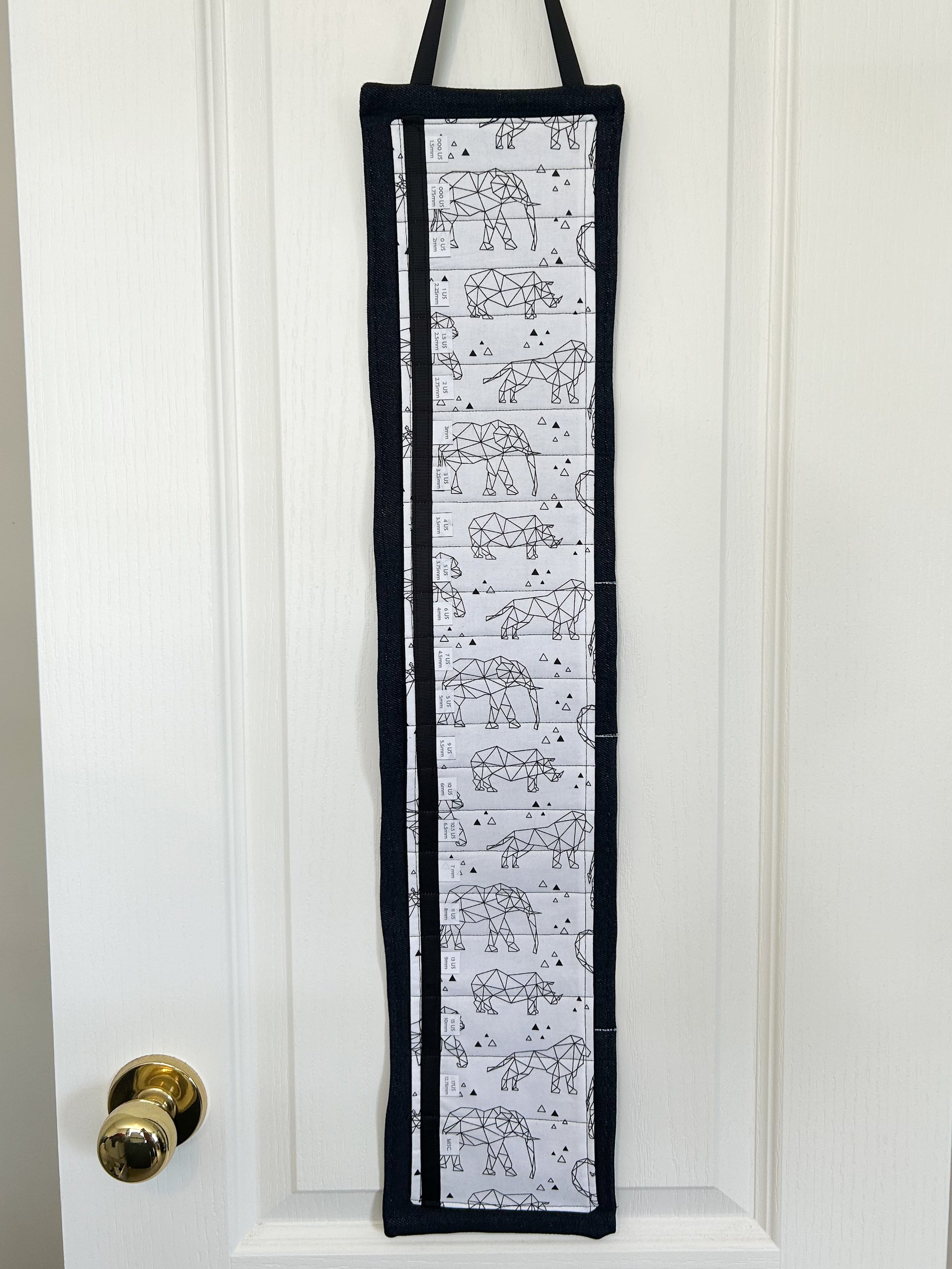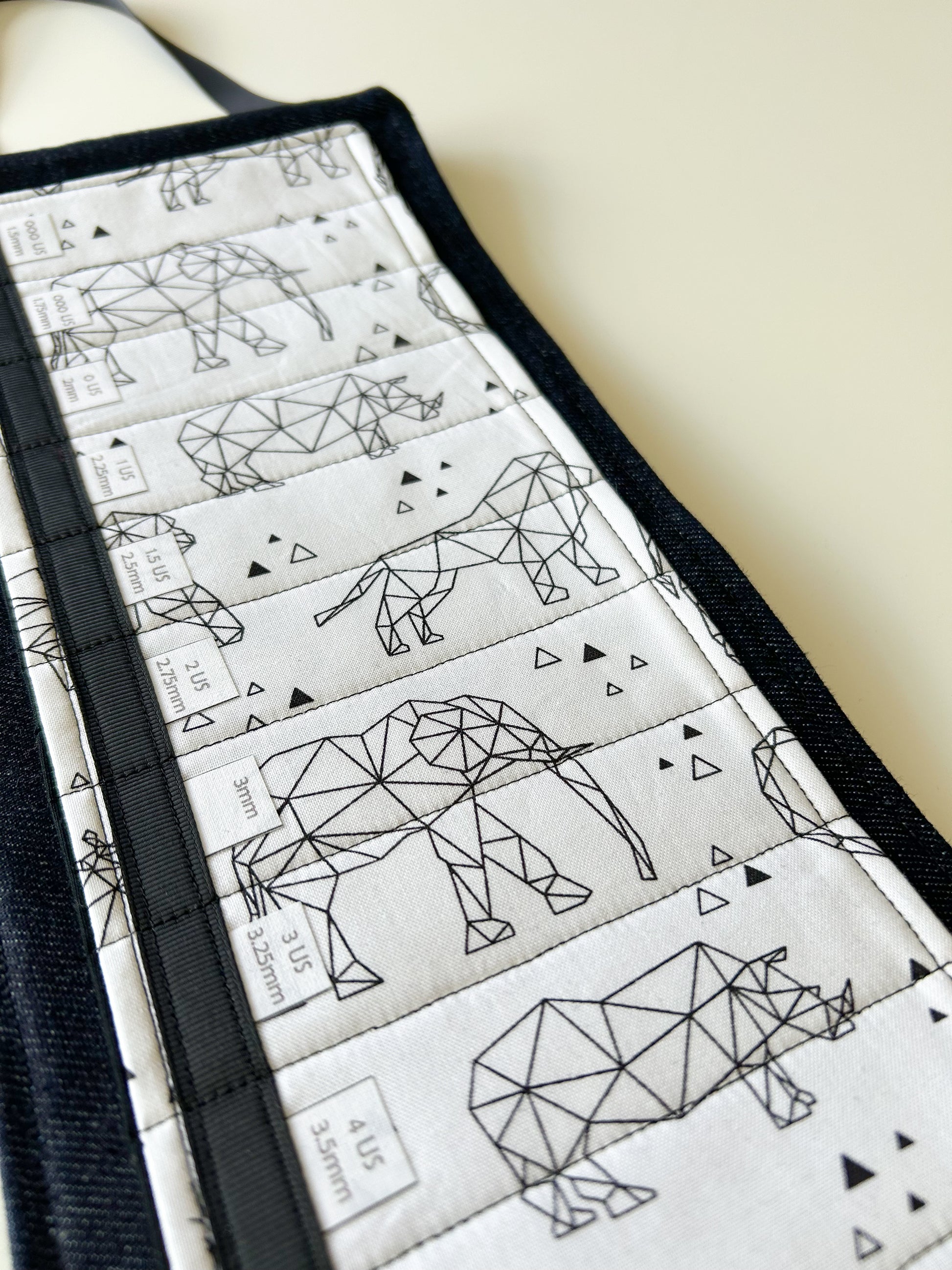 These circular needle holders are made with new denim and 100% cotton fabric. There is one layer of fusible interfacing to provide stability to channels. Each label is printed on fabric to be able to read the size with ease. Wooden dowels are inserted at the top and bottom of each hanger to keep from curling.