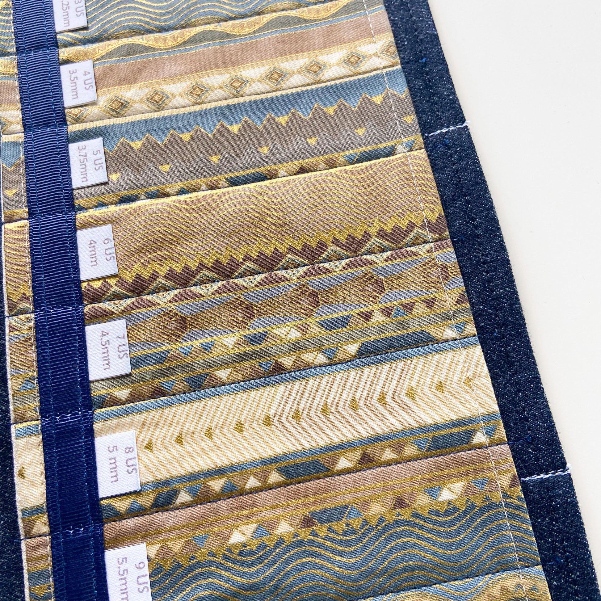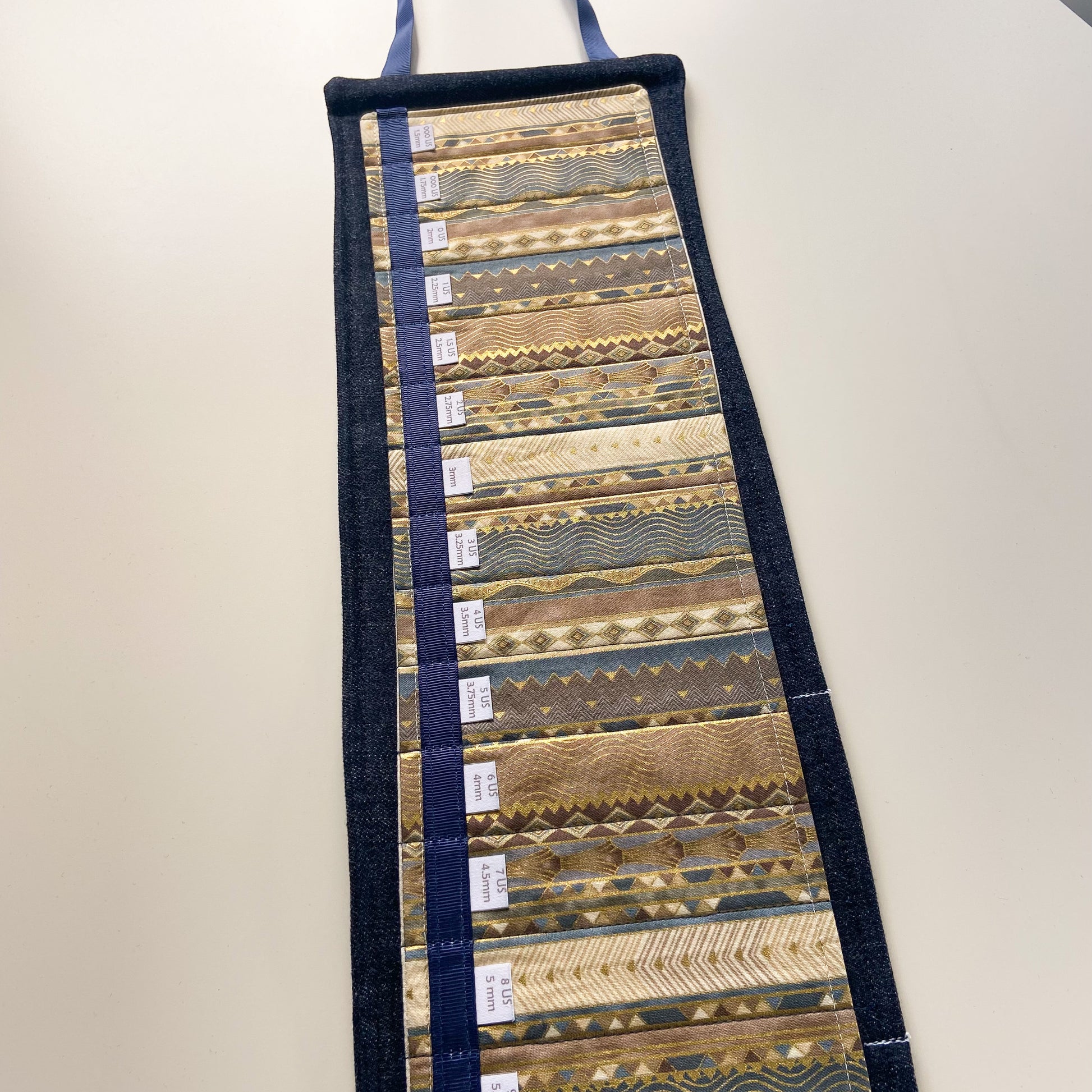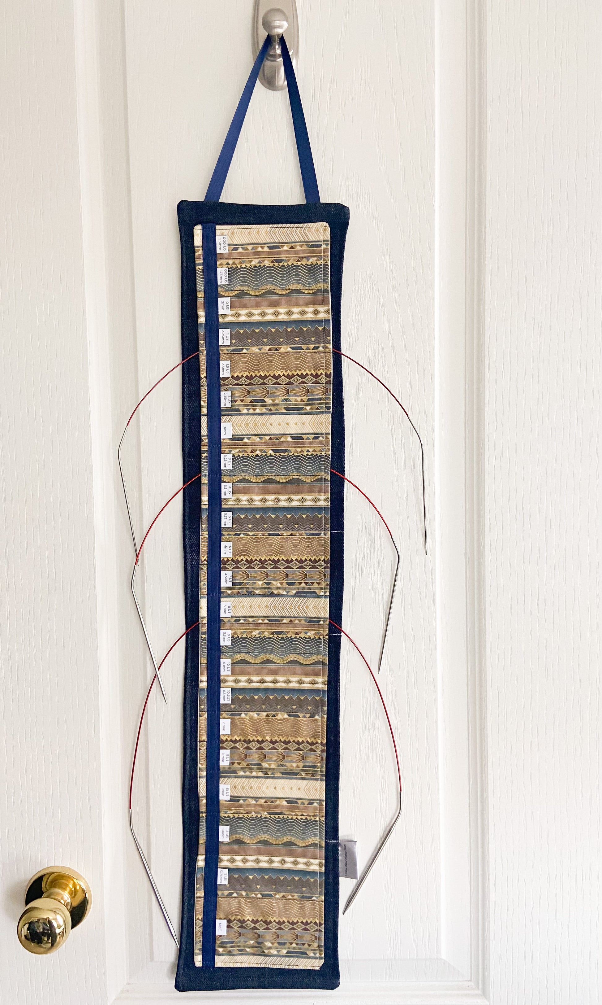 These circular needle holders are made with new denim and 100% cotton fabric. There is one layer of fusible interfacing to provide stability to channels. Each label is printed on fabric to be able to read the size with ease. Wooden dowels are inserted at the top and bottom of each hanger to keep from curling.