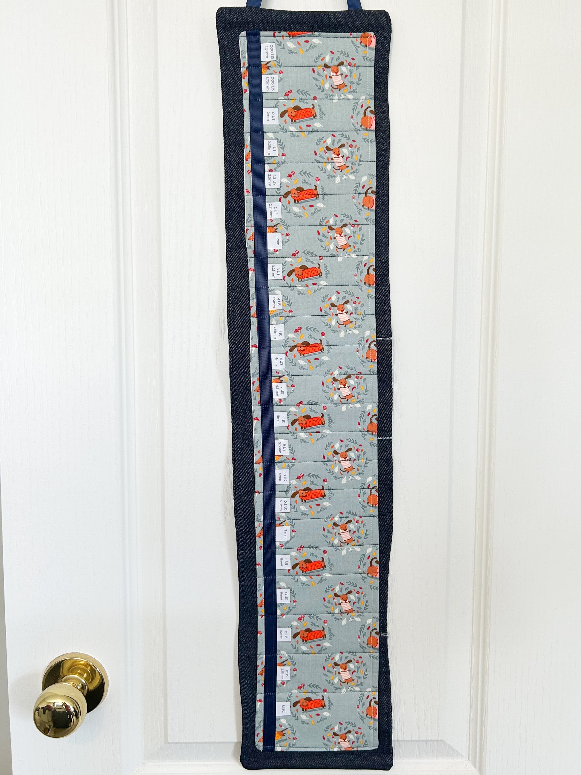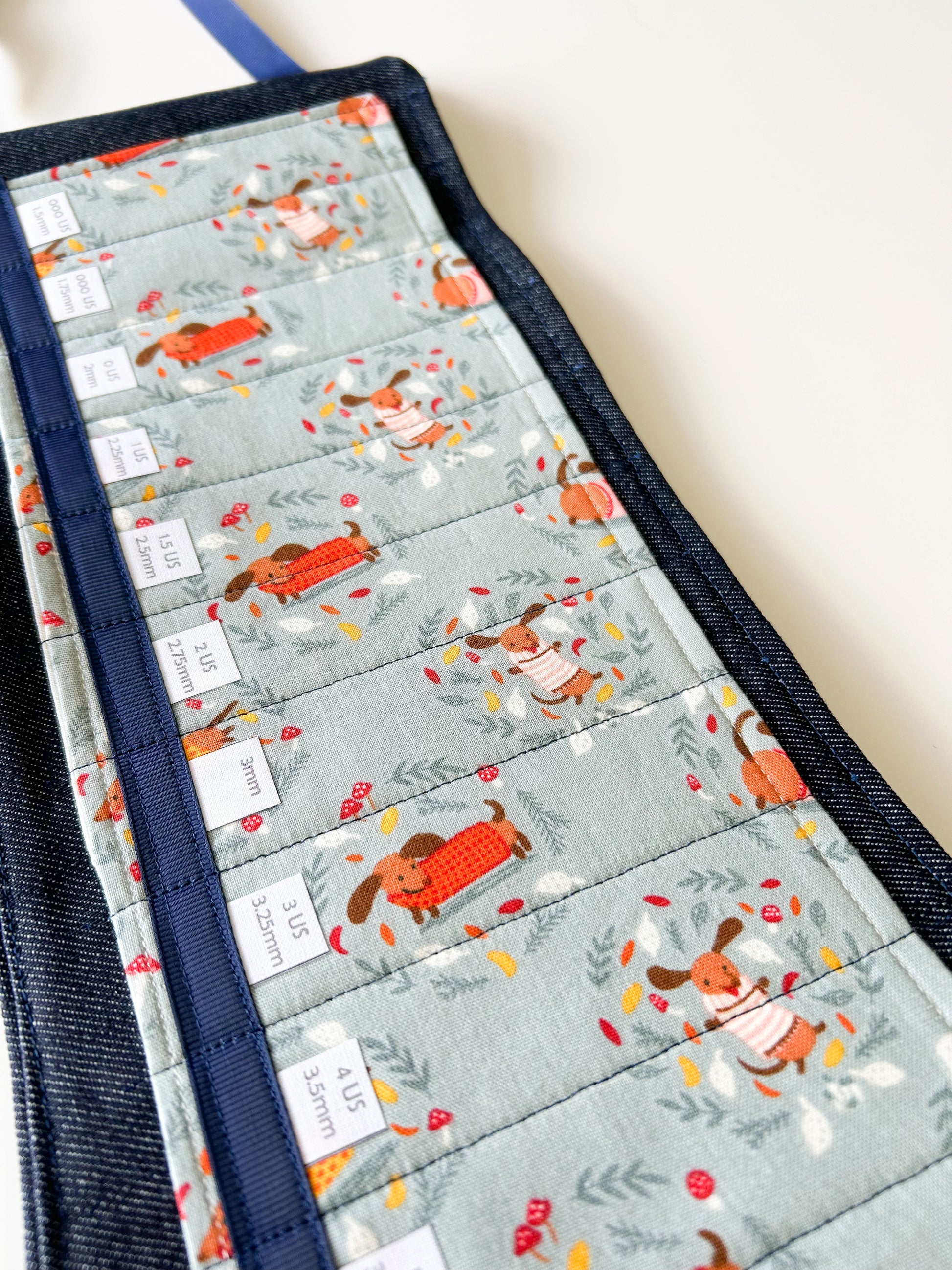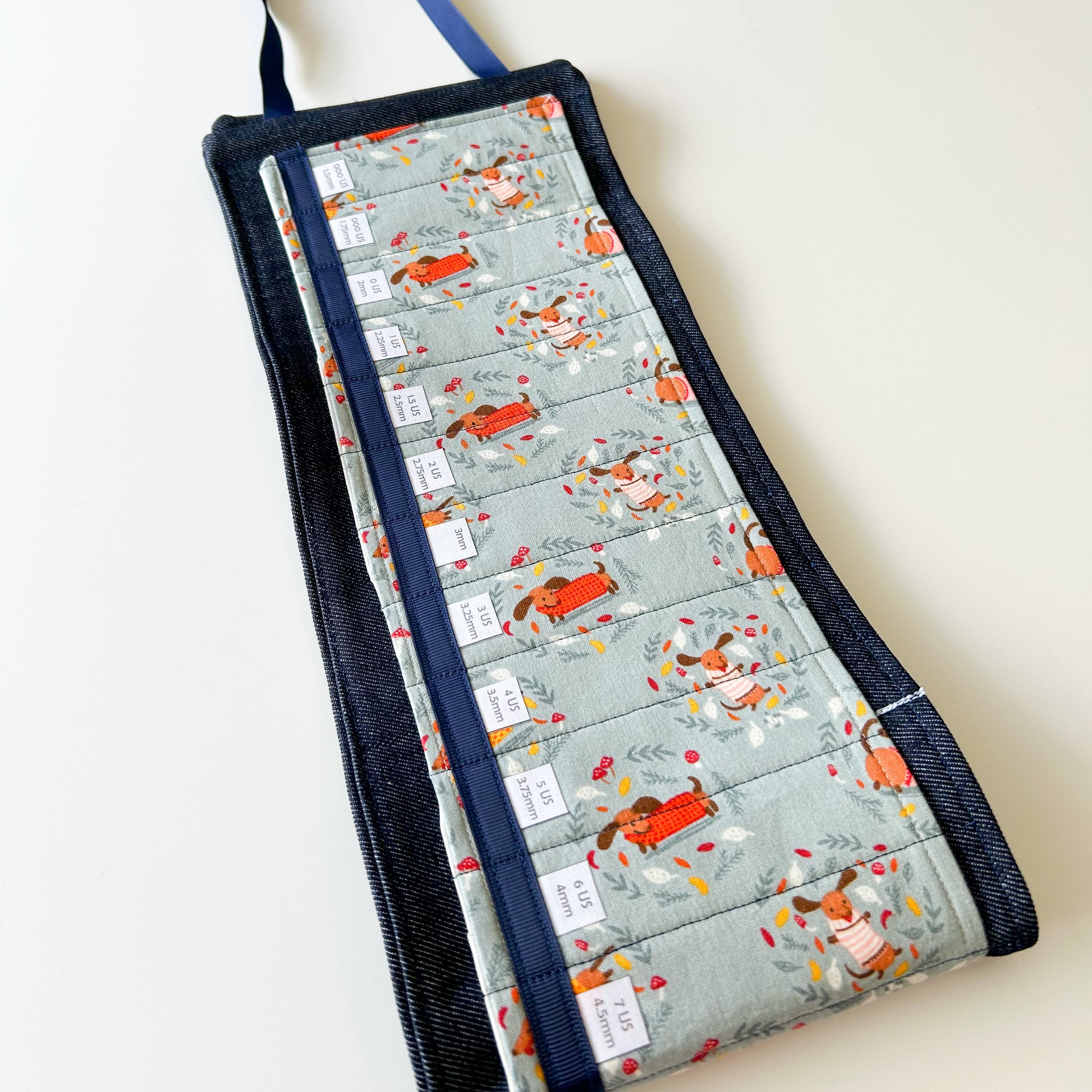 These circular needle holders are made with new denim and 100% cotton fabric. There is one layer of fusible interfacing to provide stability to channels. Each label is printed on fabric to be able to read the size with ease. Wooden dowels are inserted at the top and bottom of each hanger to keep from curling.