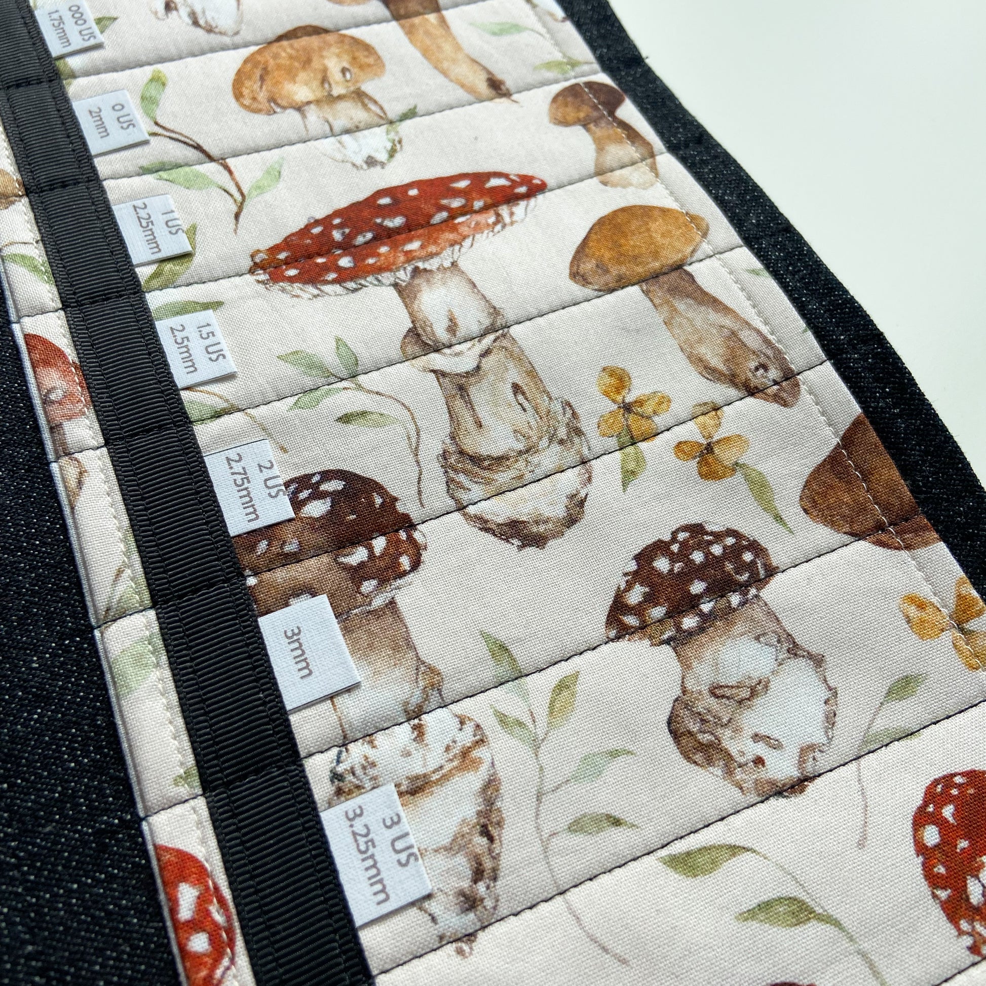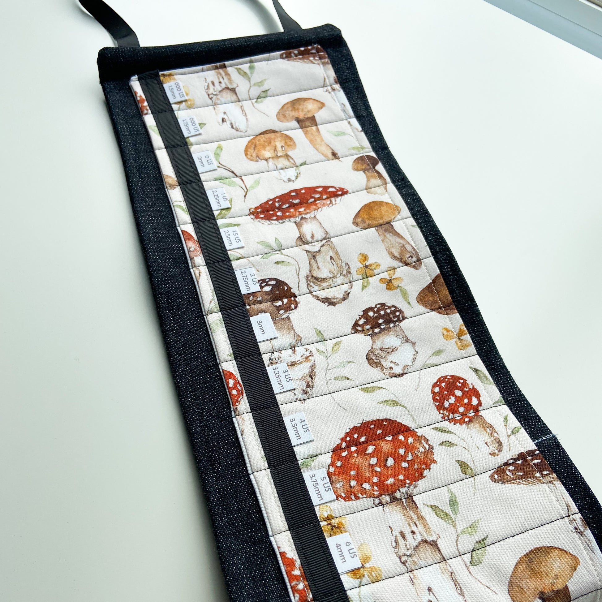 These circular needle holders are made with new denim and 100% cotton fabric. There is one layer of fusible interfacing to provide stability to channels. Each label is printed on fabric to be able to read the size with ease. Wooden dowels are inserted at the top and bottom of each hanger to keep from curling.