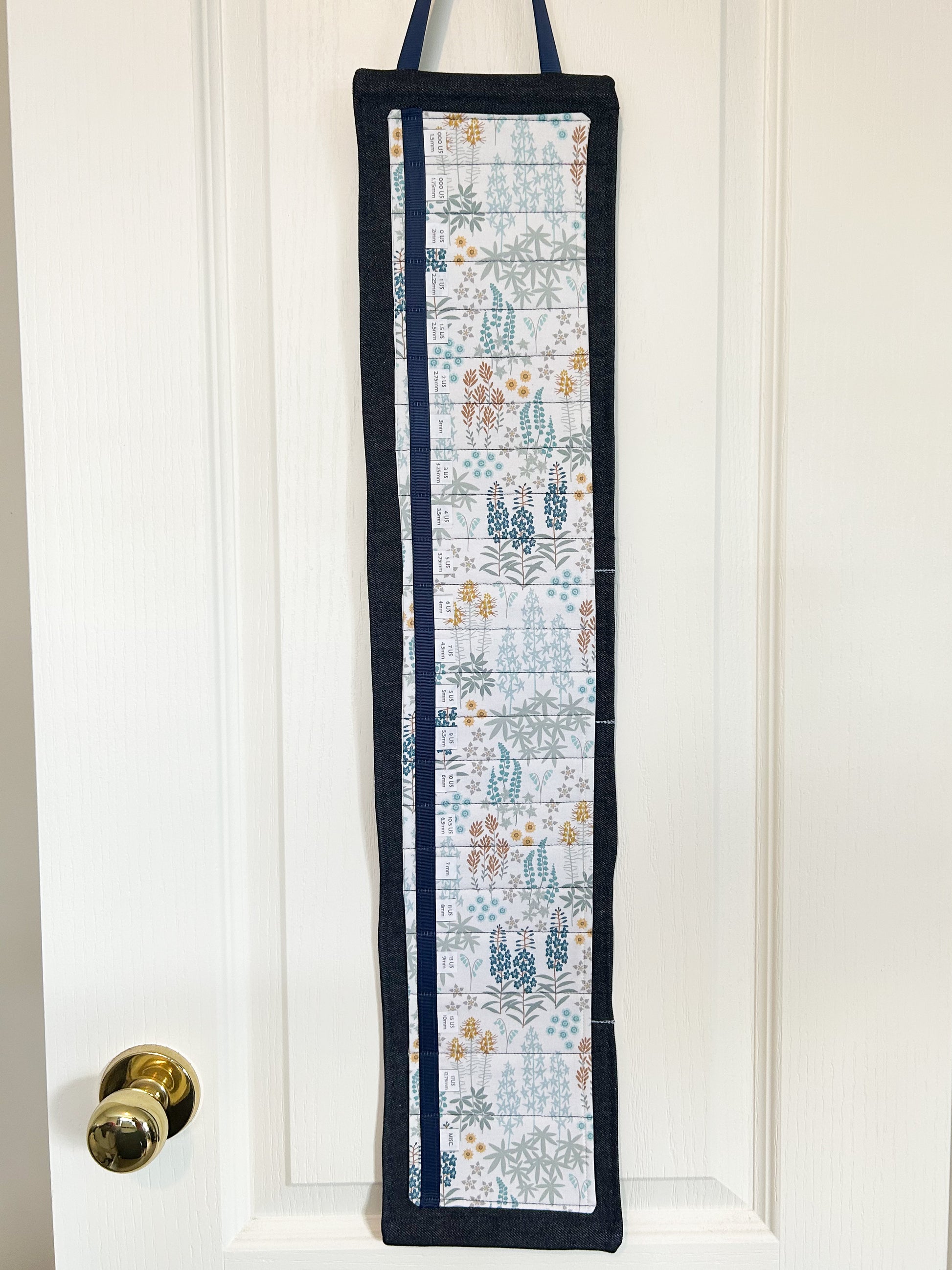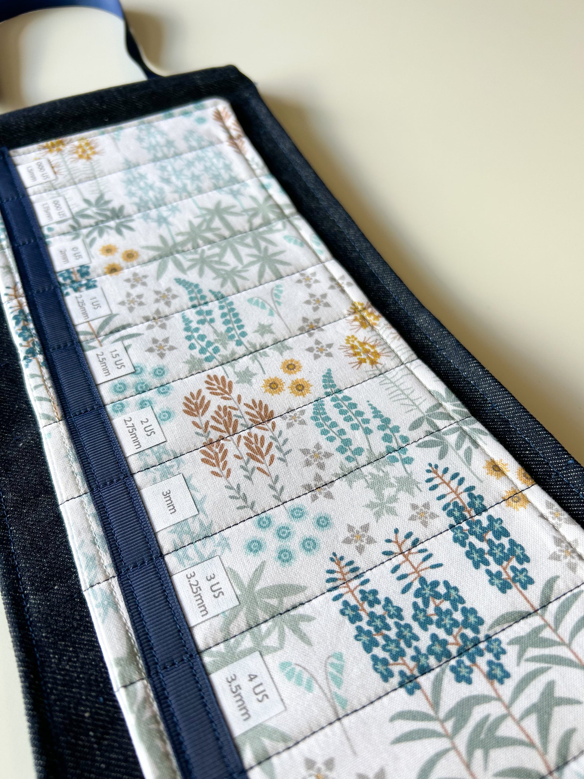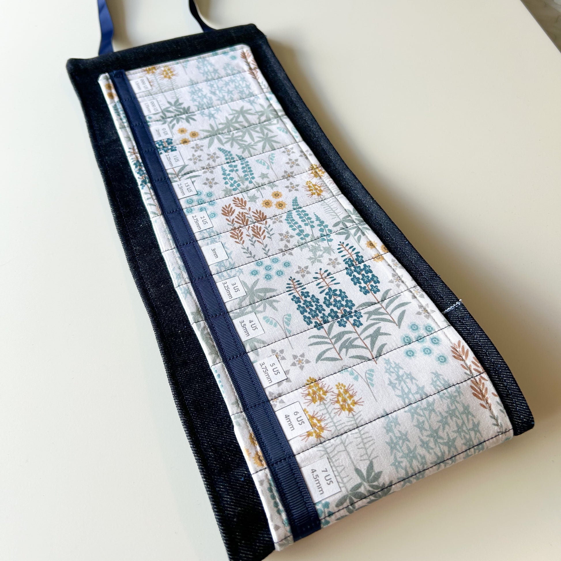 These circular needle holders are made with new denim and 100% cotton fabric. There is one layer of fusible interfacing to provide stability to channels. Each label is printed on fabric to be able to read the size with ease. Wooden dowels are inserted at the top and bottom of each hanger to keep from curling.