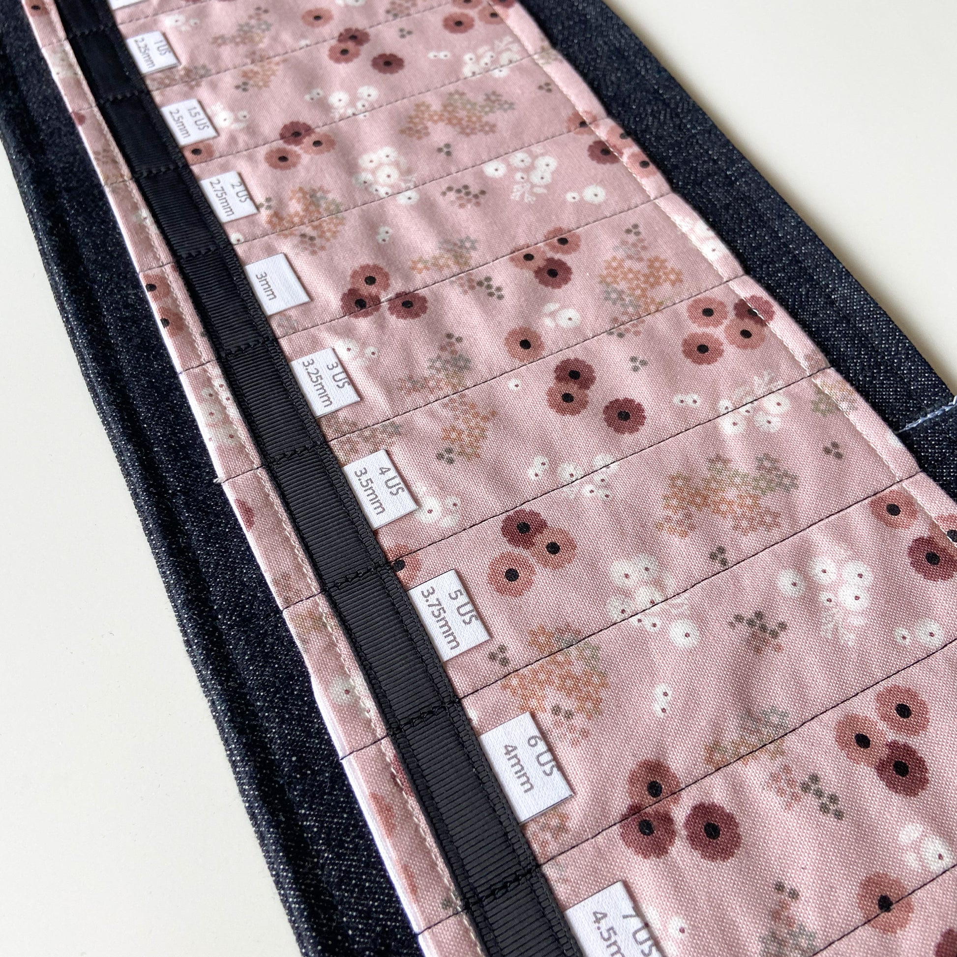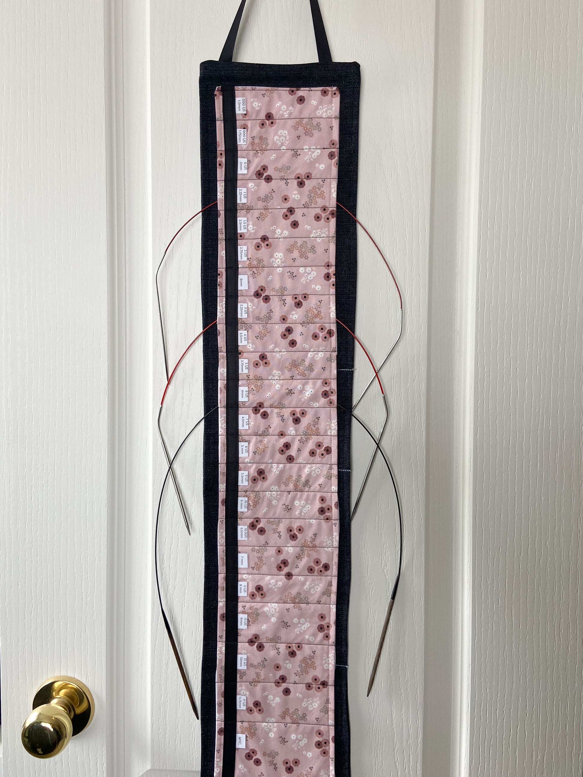 These circular needle holders are made with new denim and 100% cotton fabric. There is one layer of fusible interfacing to provide stability to channels. Each label is printed on fabric to be able to read the size with ease. Wooden dowels are inserted at the top and bottom of each hanger to keep from curling.
