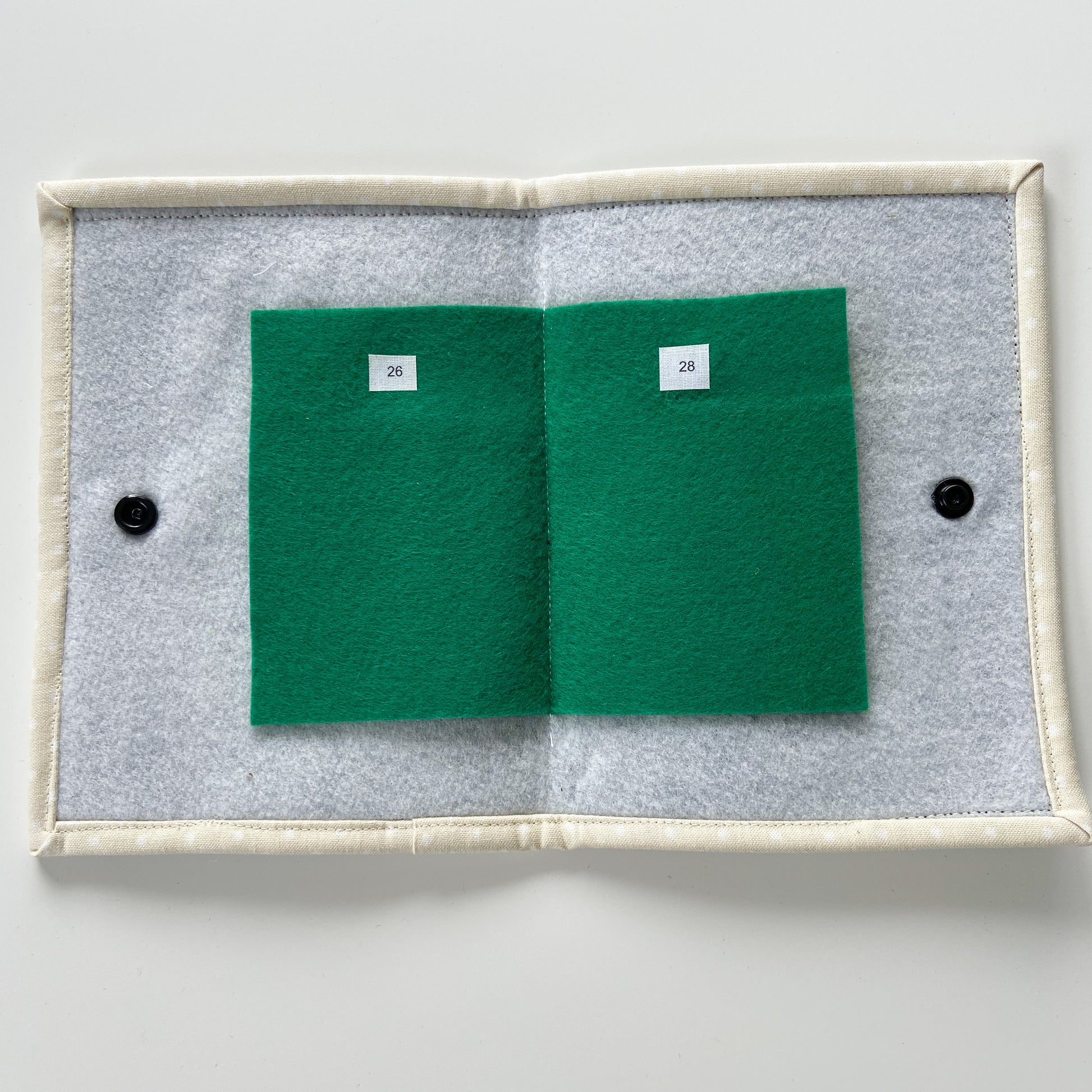 Each needle holder are made with new denim and 100% cotton fabric. There is one layer of fusible interfacing to provide stability and to hold extra floss strands. Each felt piece is labeled with the various needle sizes we use (24/26/28/Misc) to keep you going on your many projects.