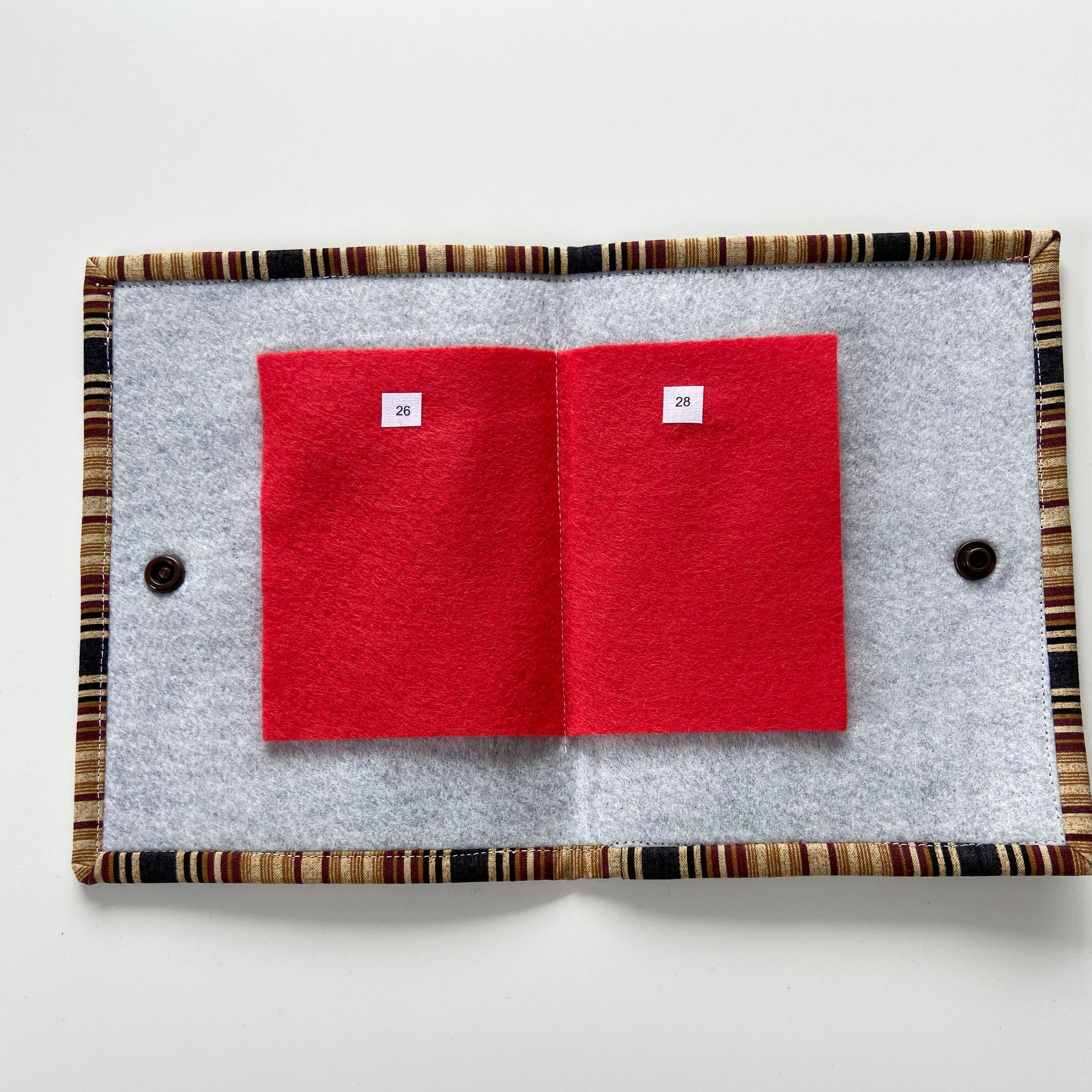 Each needle holder are made with new denim and 100% cotton fabric. There is one layer of fusible interfacing to provide stability and to hold extra floss strands. Each felt piece is labeled with the various needle sizes we use (24/26/28/Misc) to keep you going on your many projects.