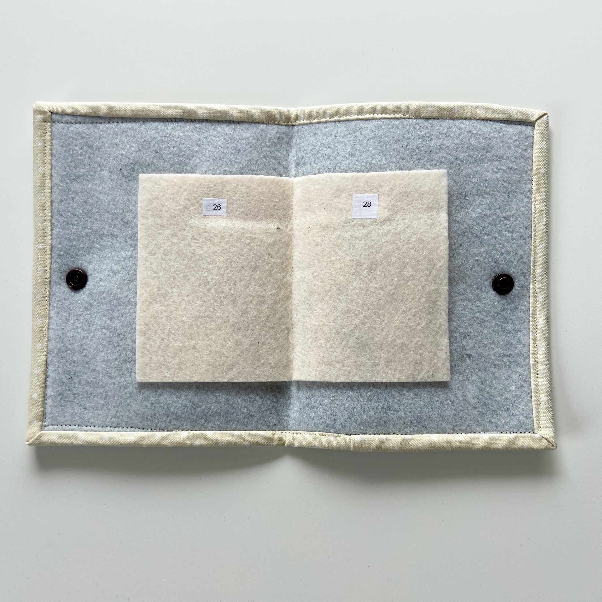 Each needle holder are made with new denim and 100% cotton fabric. There is one layer of fusible interfacing to provide stability and to hold extra floss strands. Each felt piece is labeled with the various needle sizes we use (24/26/28/Misc) to keep you going on your many projects.
