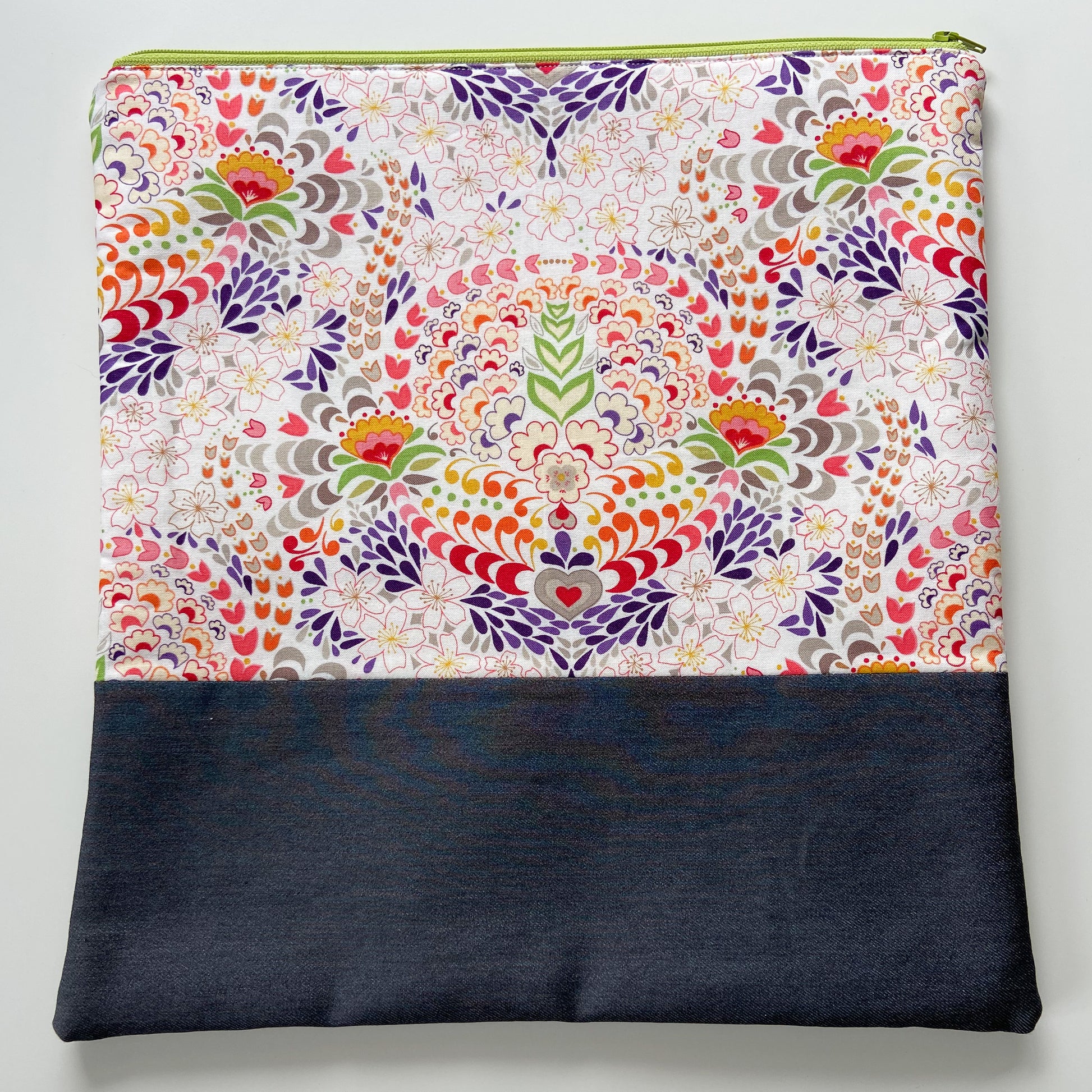 Large zippered project bag perfect for cross stitch supplies with 11" Q-Snap or hoops. This bag is made with a new denim outer fabric and 100% cotton lining fabric.