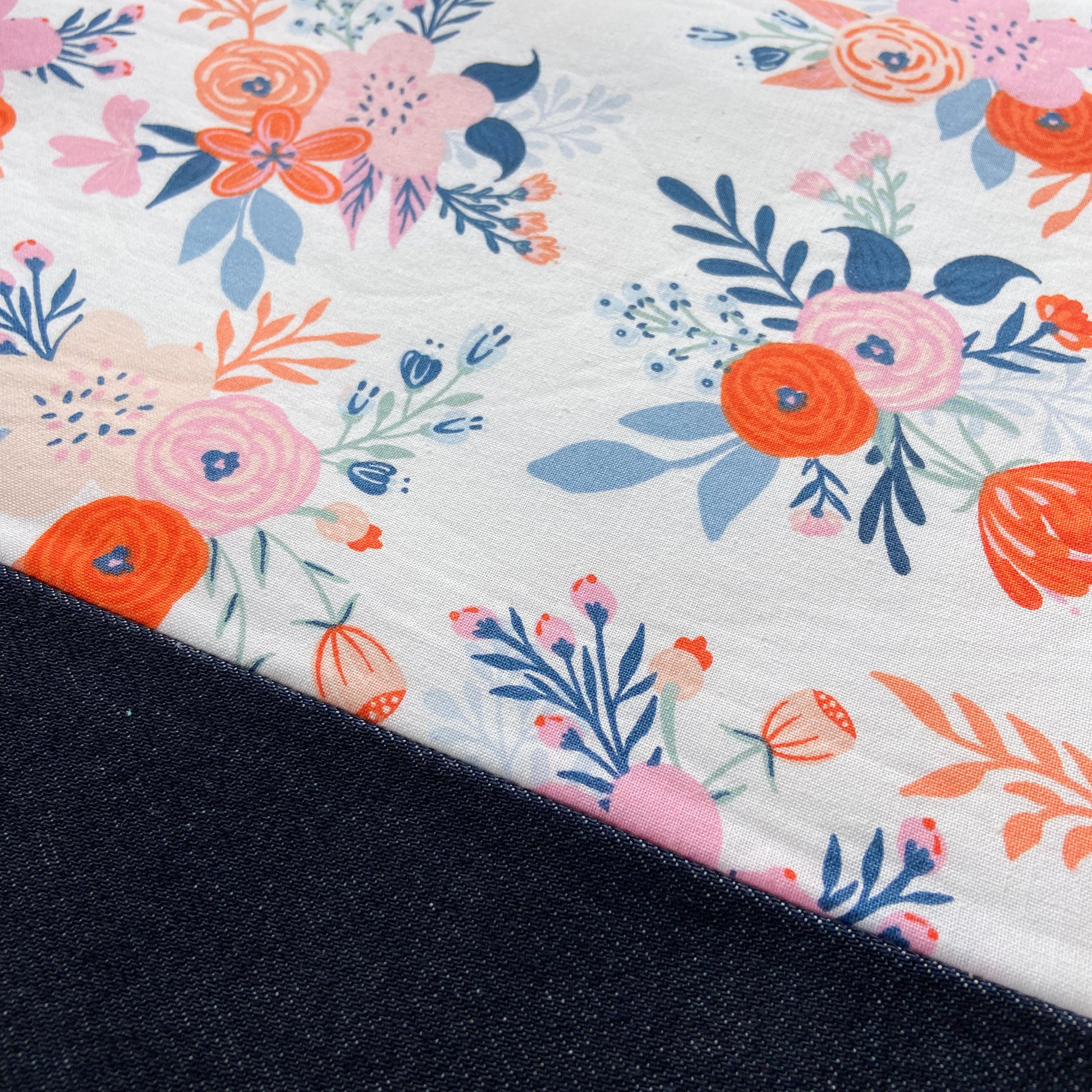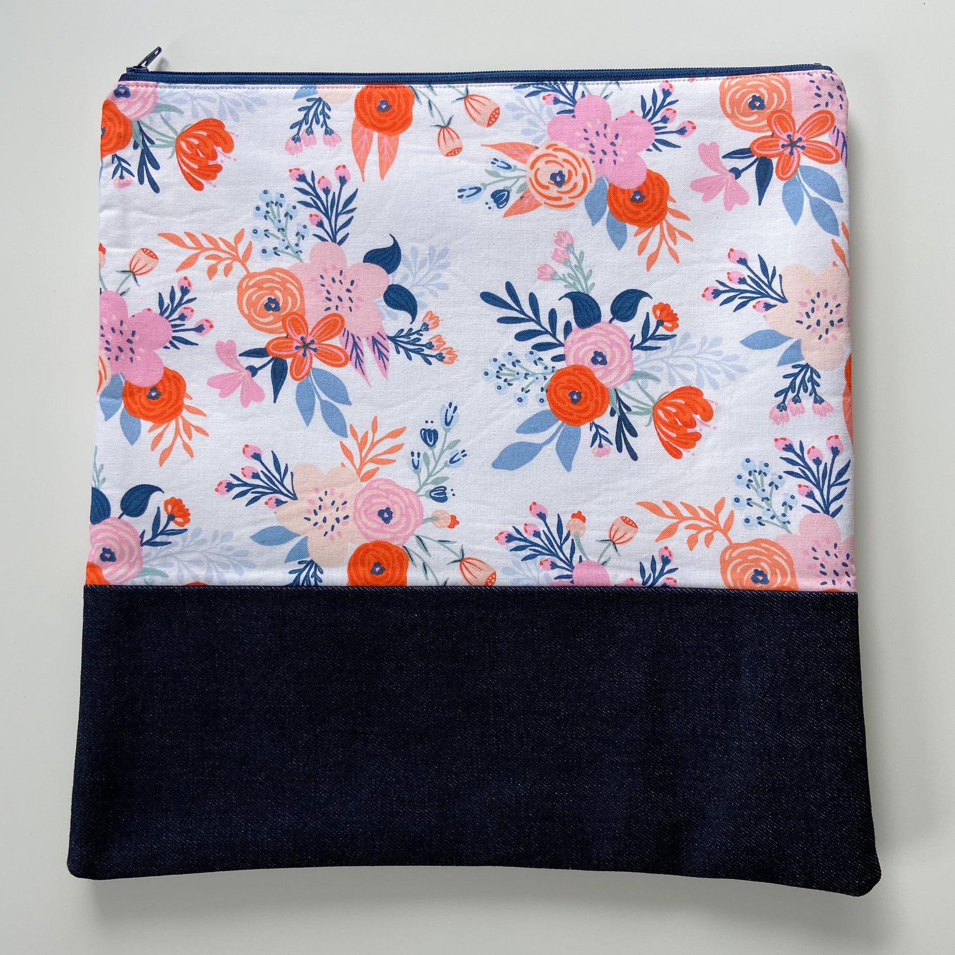 Large zippered project bag perfect for cross stitch supplies with 11" Q-Snap or hoops. This bag is made with a new denim outer fabric and 100% cotton lining fabric.