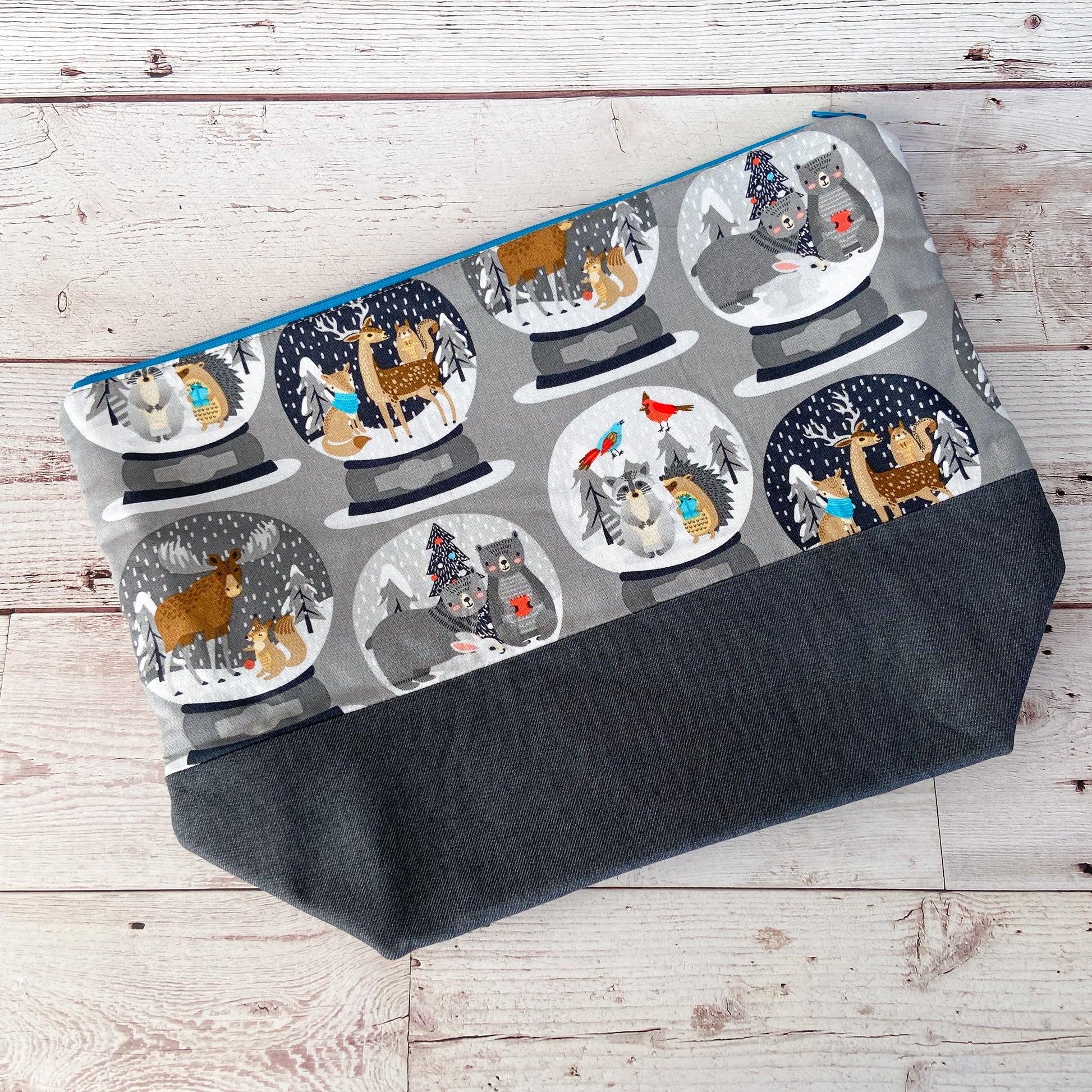 Denim - Large Zippered Project Bag - Grey Woodland Snow Globes