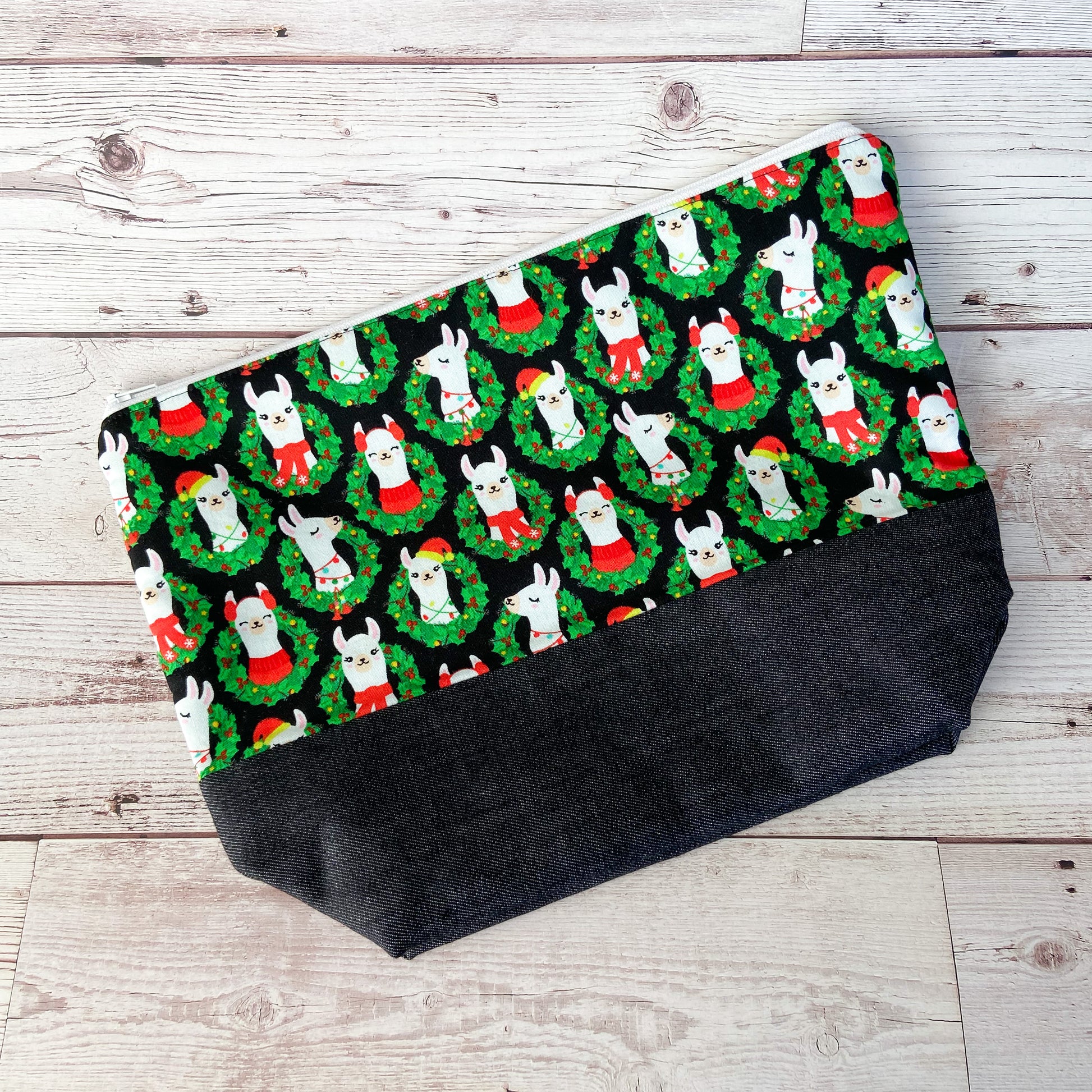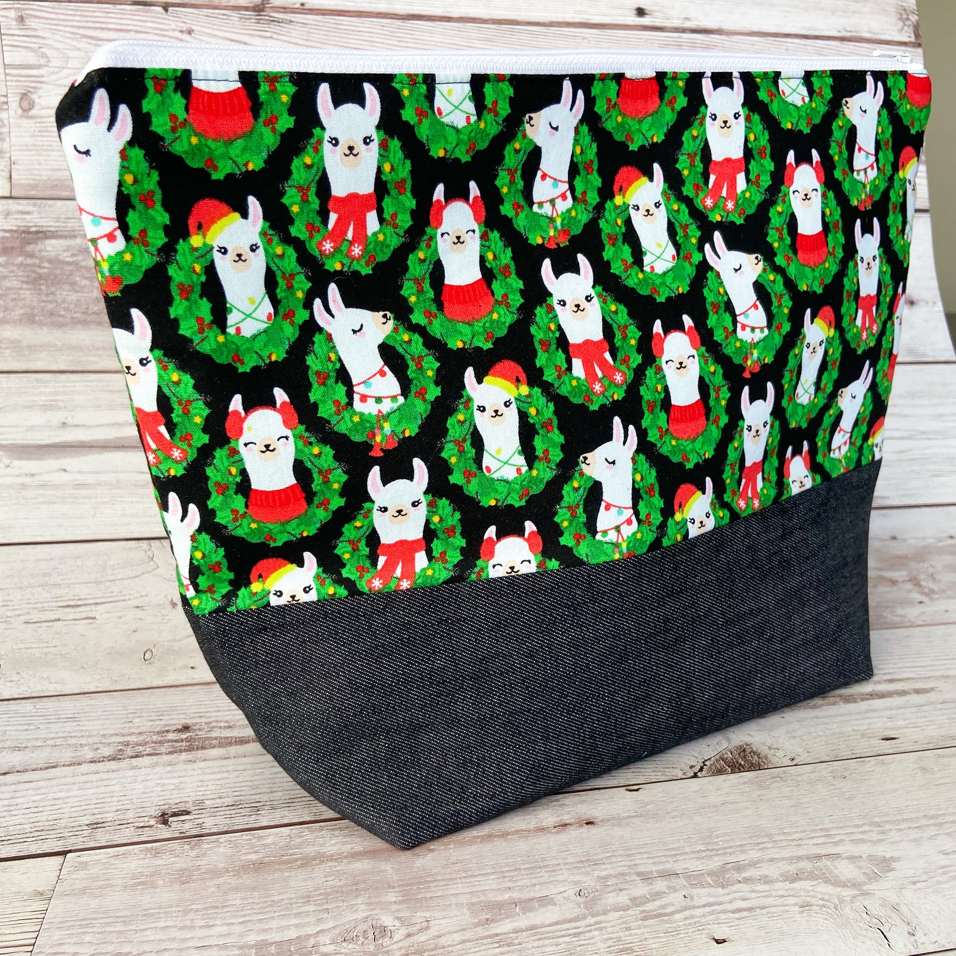 Denim - Large Zippered Project Bag - Llamas with Wreaths