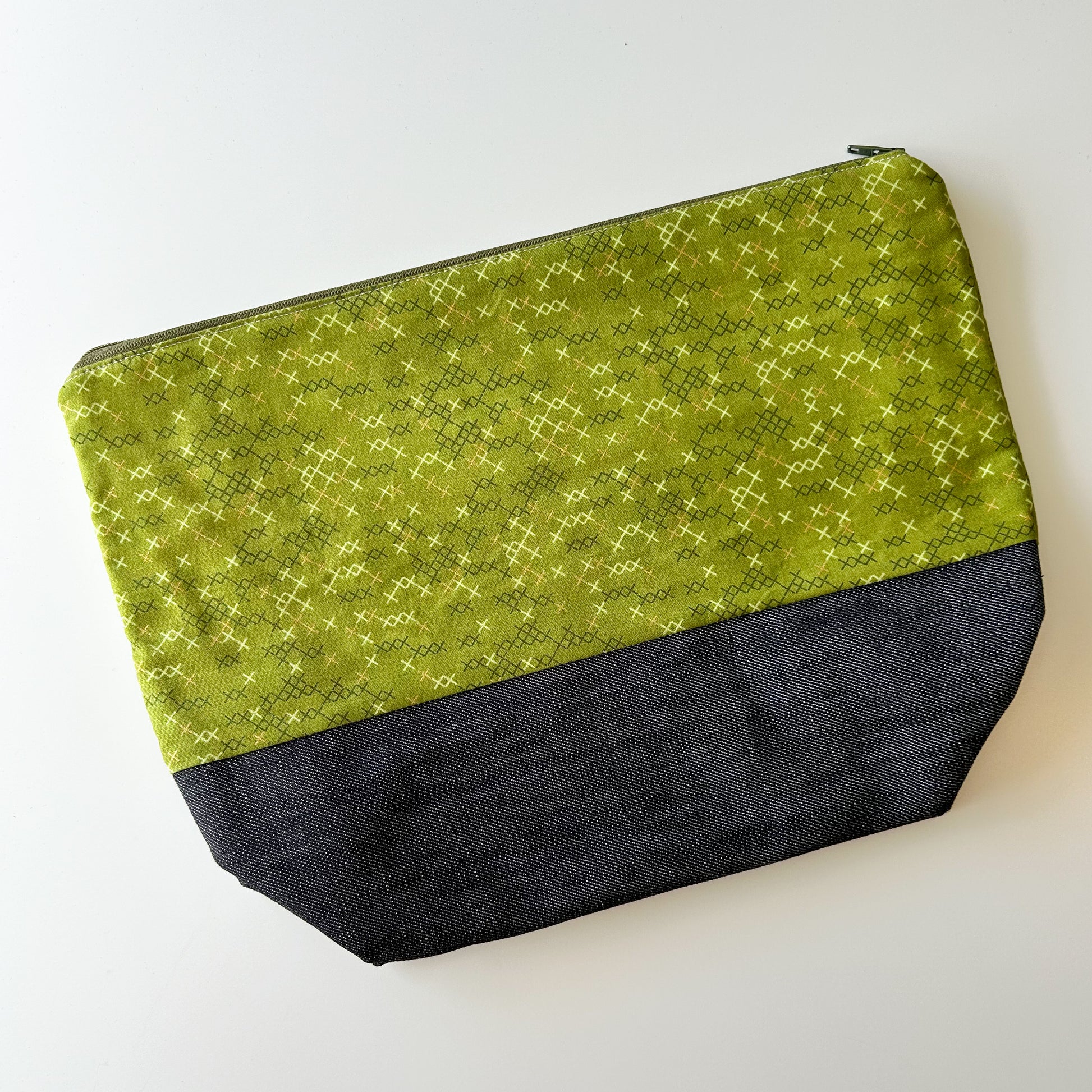 Denim - Shawl Zippered Project Bag - Green and Gold Cross Stitches