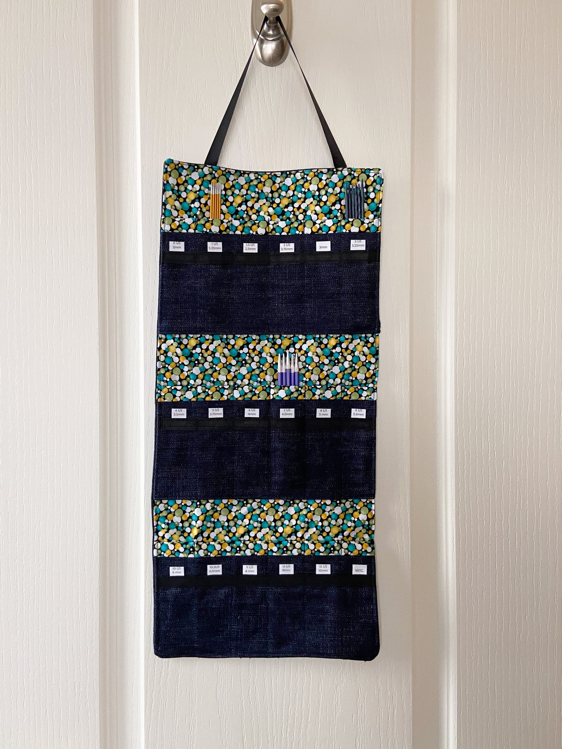 Hanging organizers with individual channels labeled with a range of needle sizes. There is plenty of space for quite a few DPN needle sets to be stored in one channel. Sizes range from 2.0mm (000 US) to 10 mm (15 US) with an added miscellaneous spot at the end.