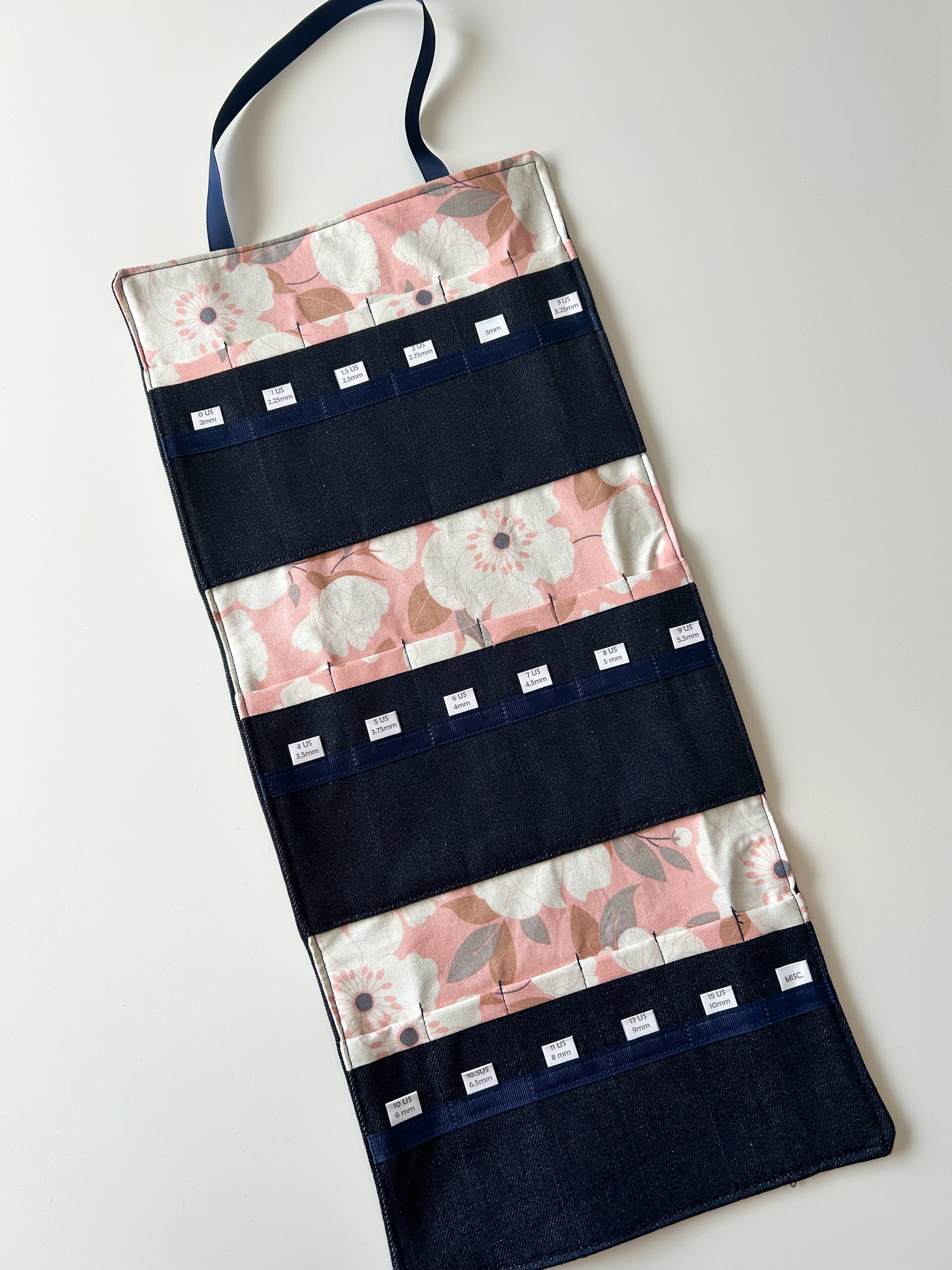 These DPN needle organizers are made with new denim and 100% cotton fabric. There is one layer of fusible interfacing to provide stability to channels. Each label is printed on fabric to be able to read the size with ease.