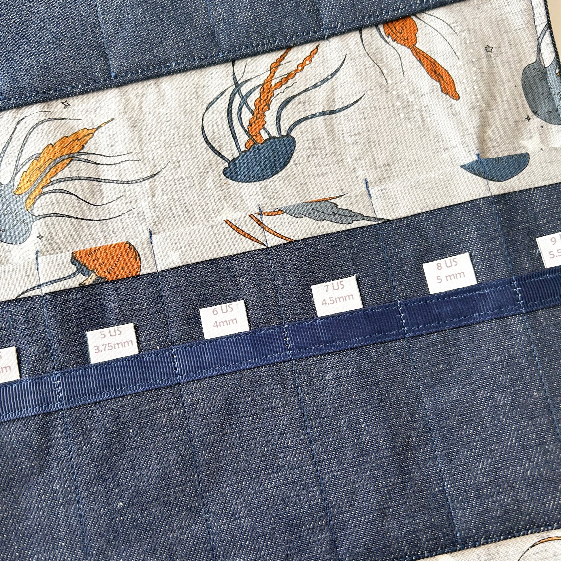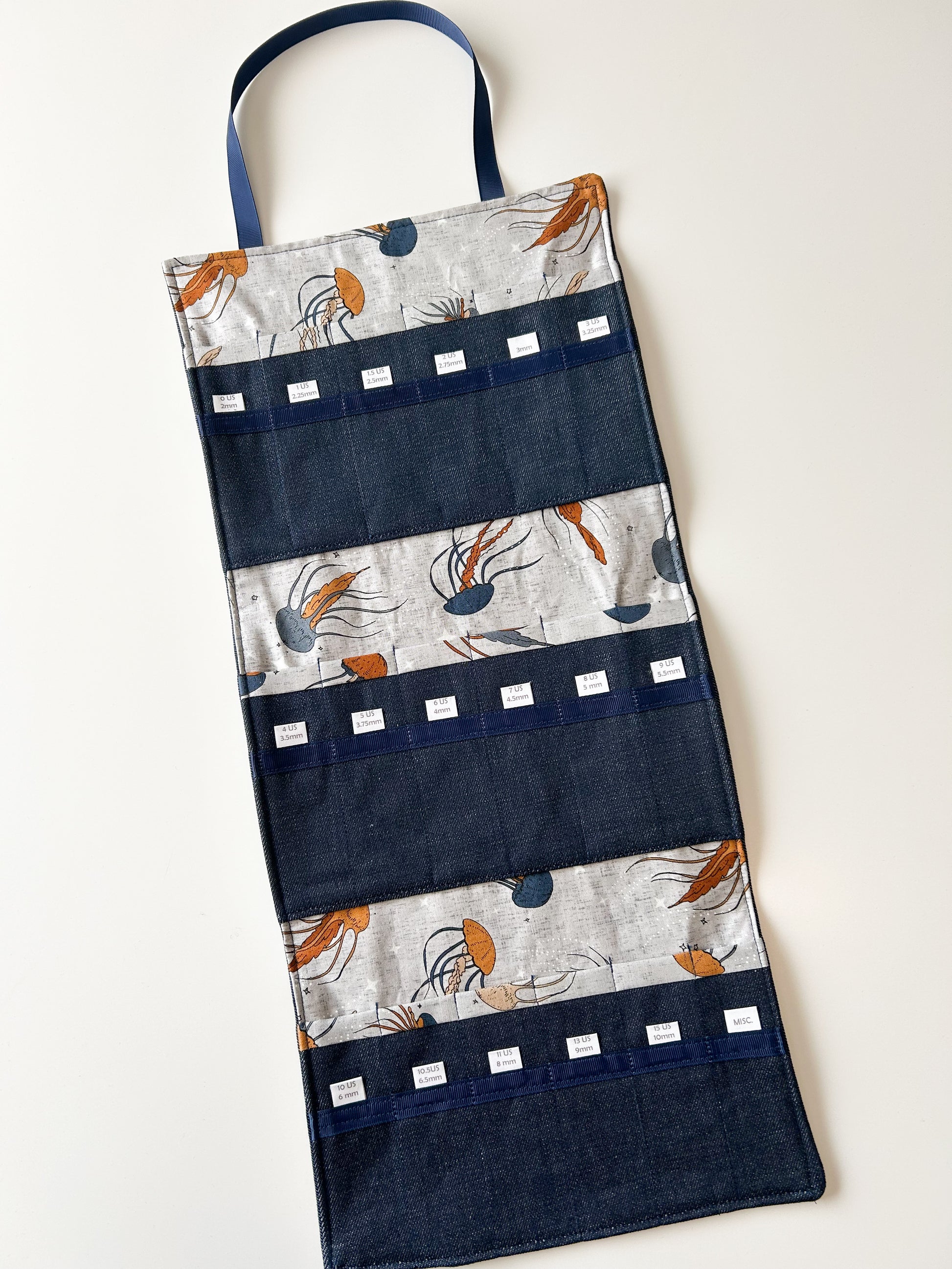 These DPN needle organizers are made with new denim and 100% cotton fabric. There is one layer of fusible interfacing to provide stability to channels. Each label is printed on fabric to be able to read the size with ease.