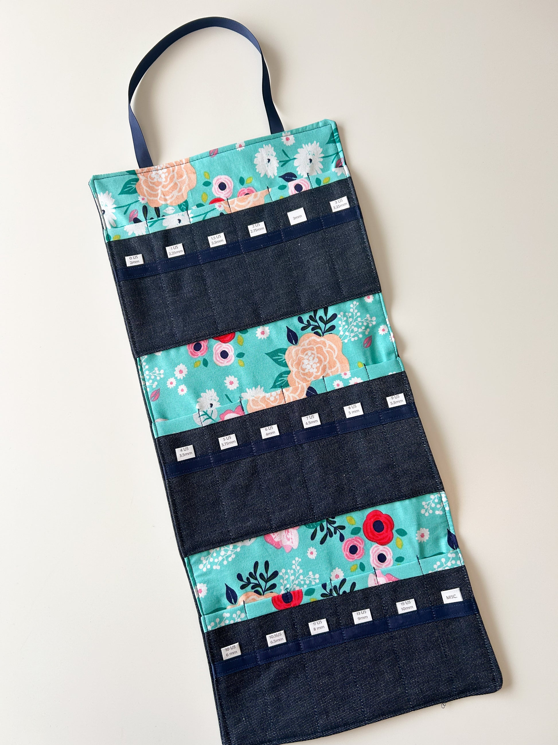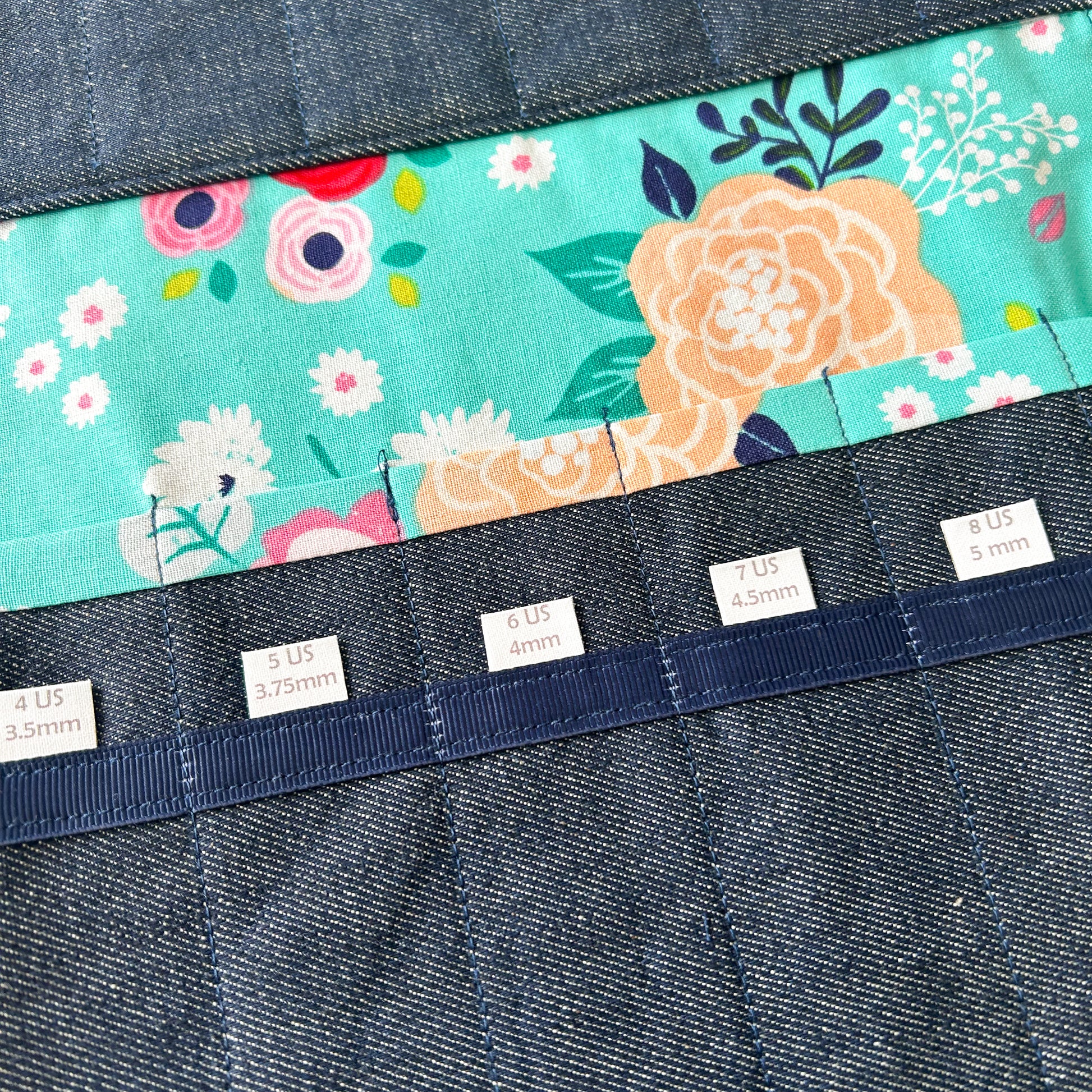 These DPN needle organizers are made with new denim and 100% cotton fabric. There is one layer of fusible interfacing to provide stability to channels. Each label is printed on fabric to be able to read the size with ease.