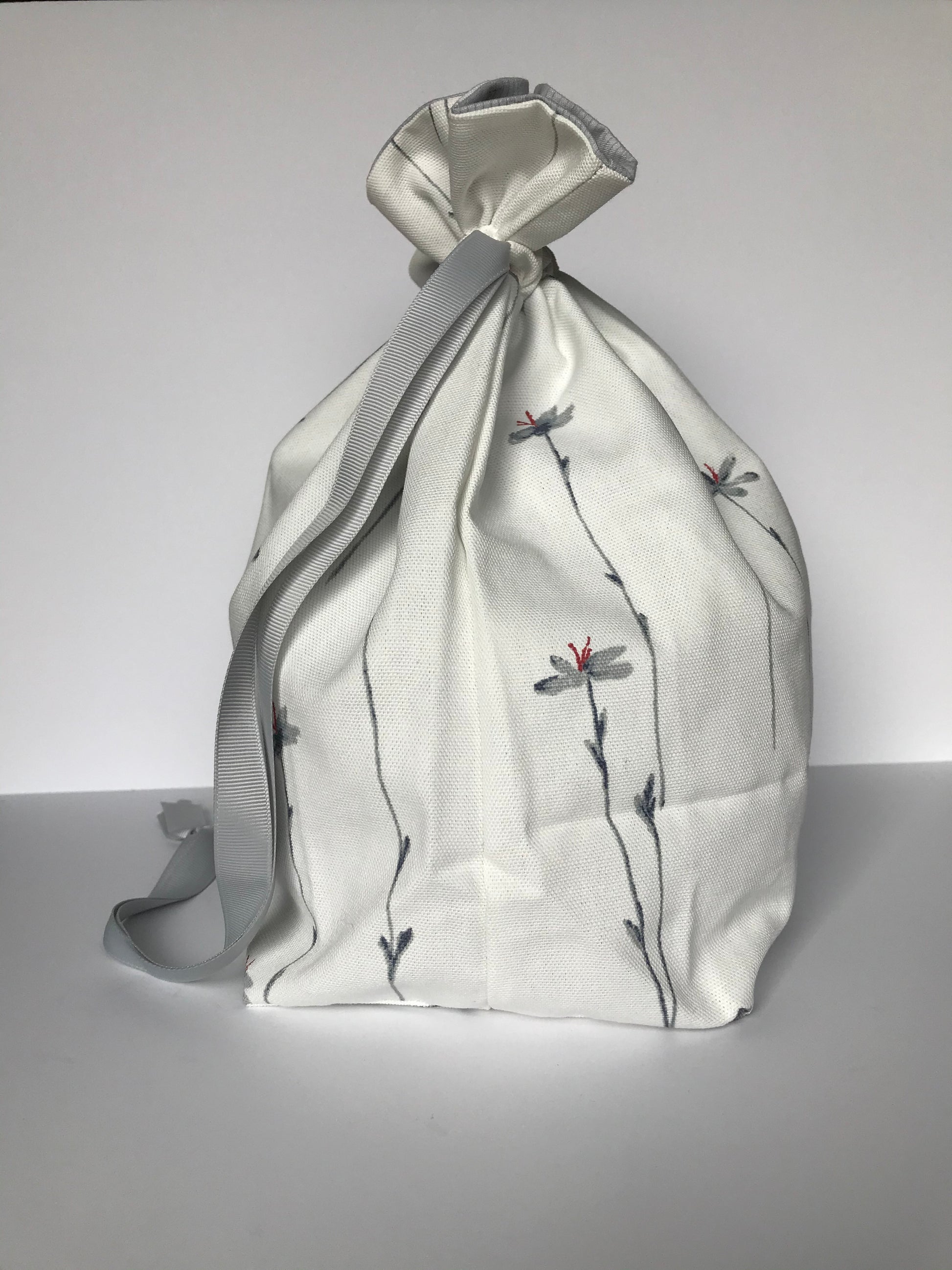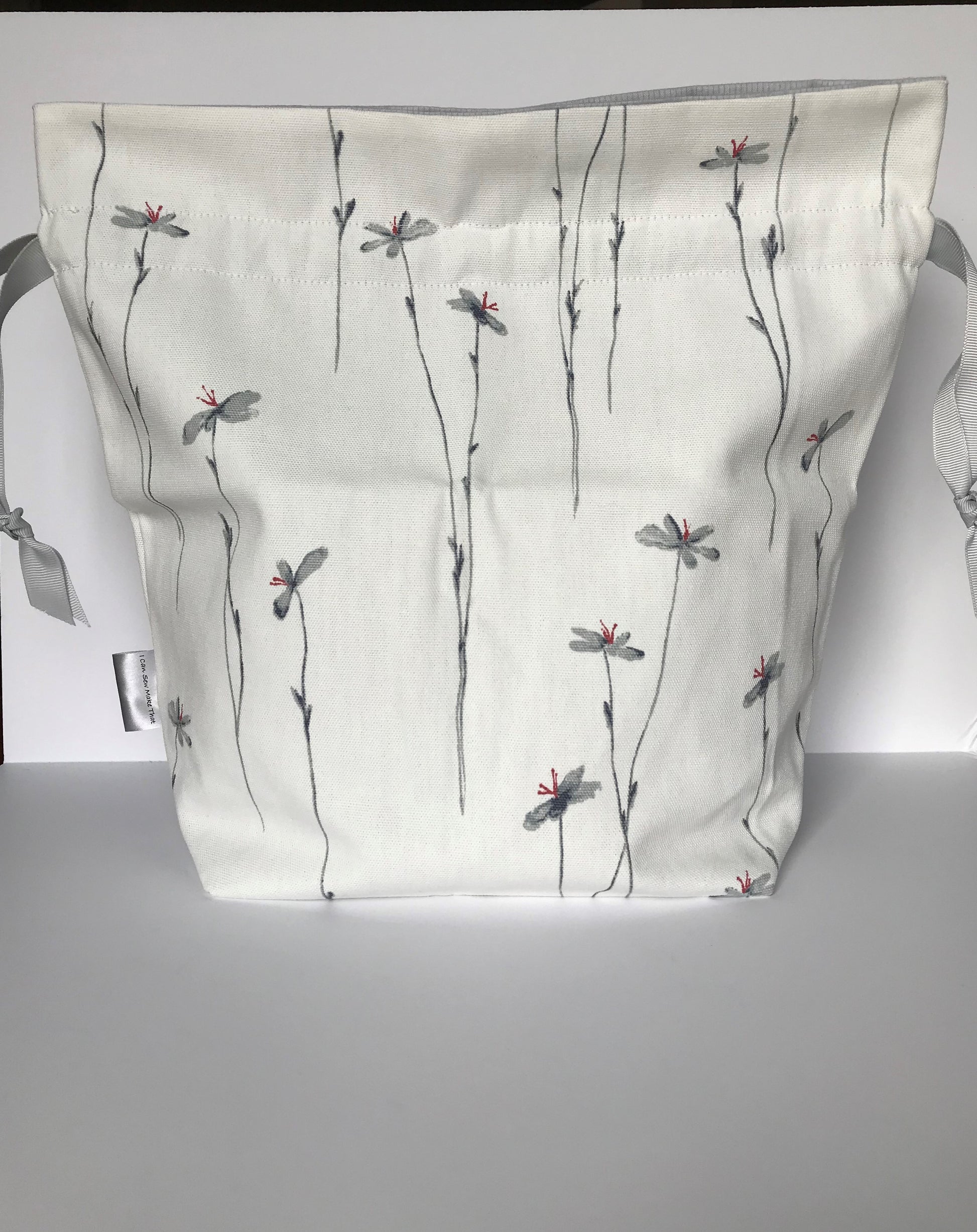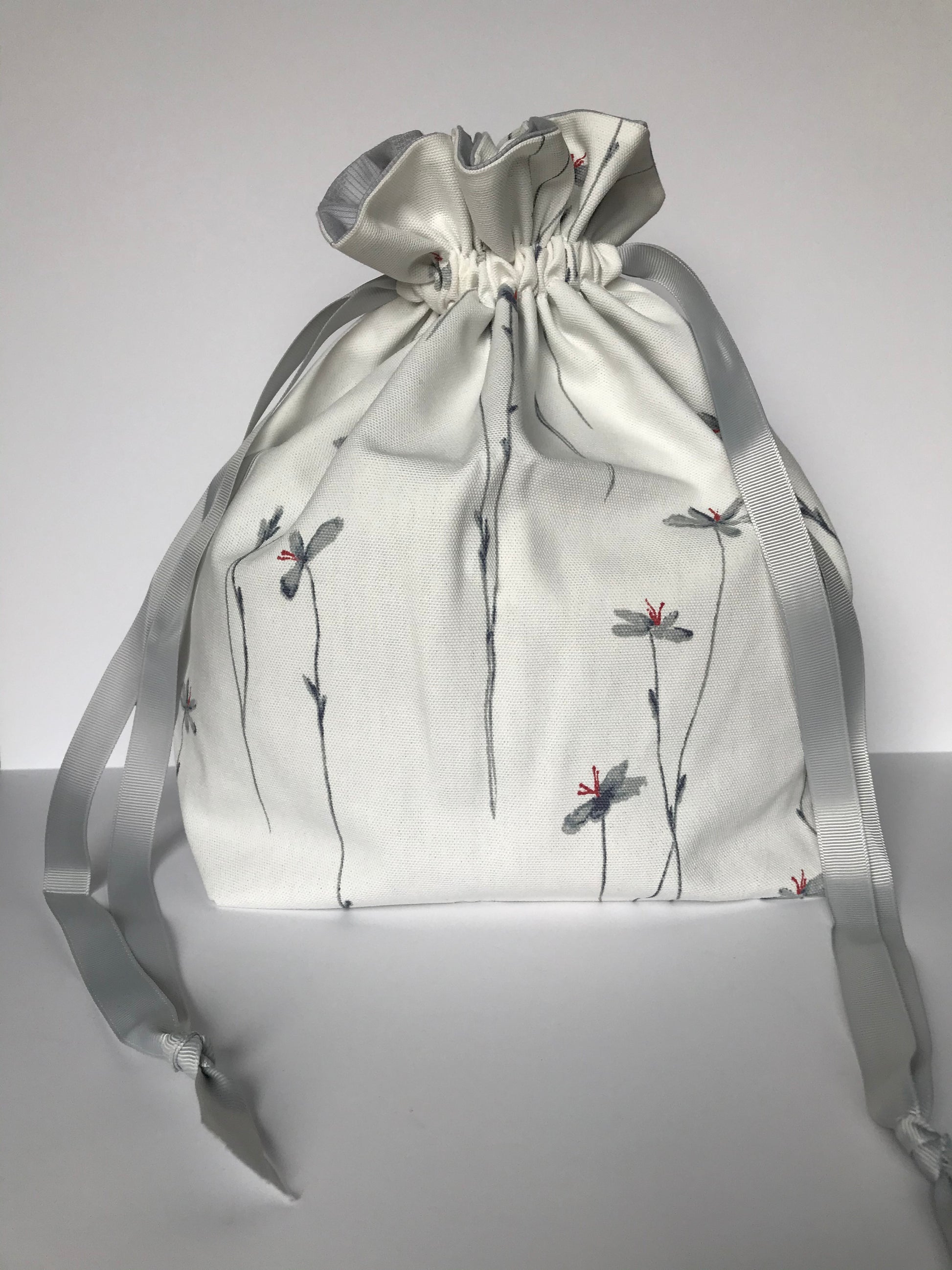This bag is made with a light canvas outer fabric and 100% cotton lining fabric. Sturdy enough to stand up, yet still squishy to toss in your on-the-go tote. Drawstring closure made with ribbon glides through fabric smoothly.