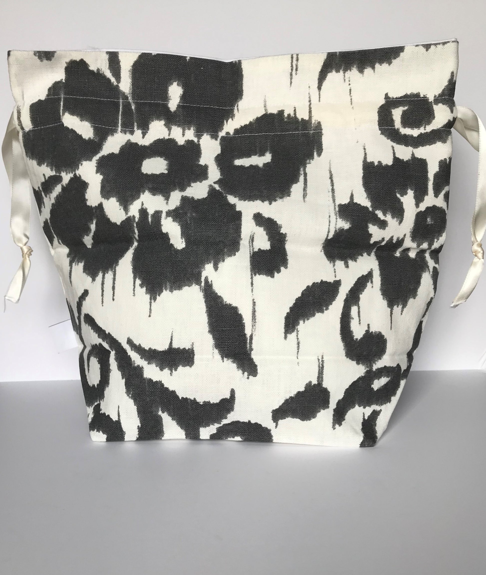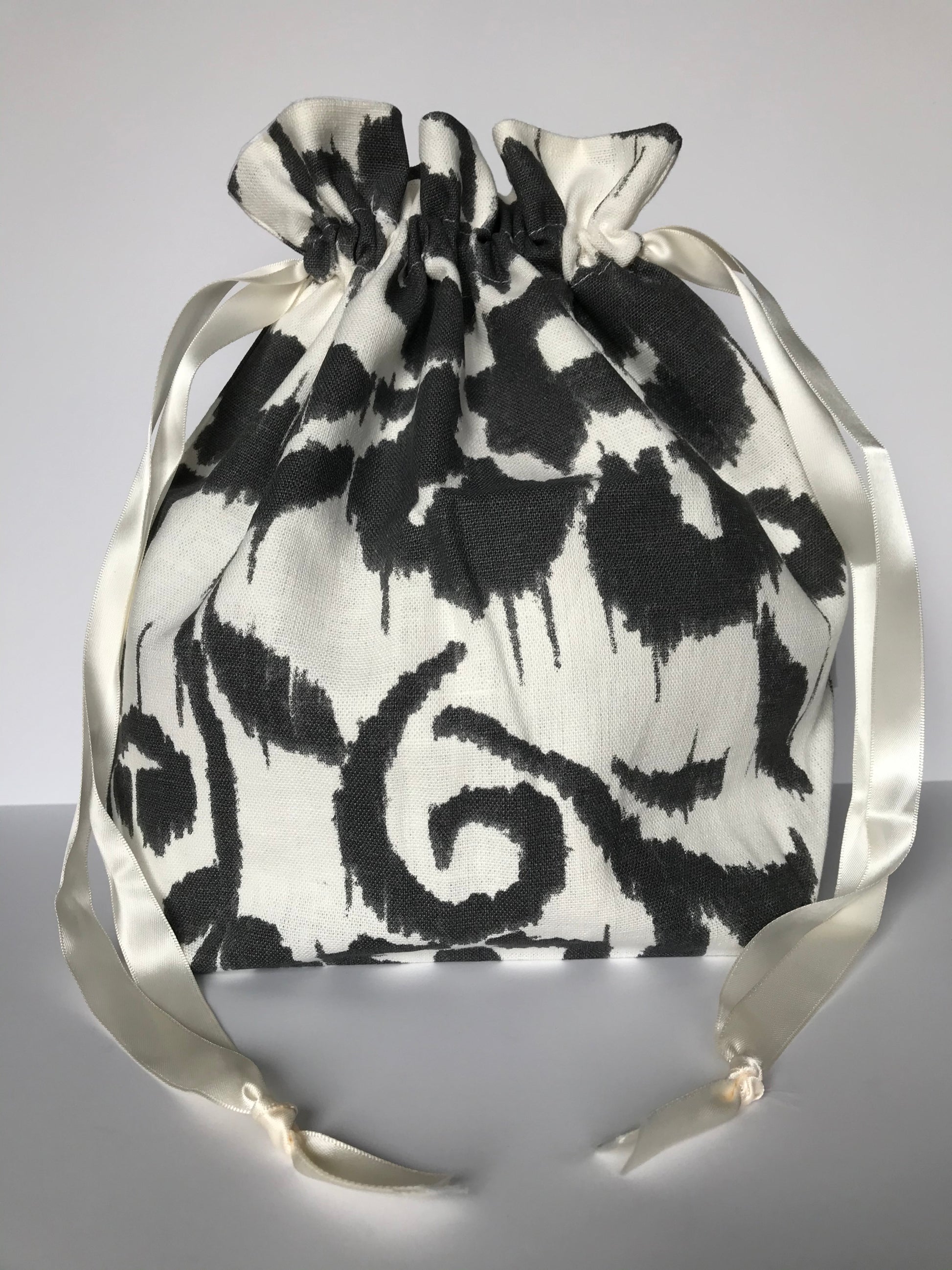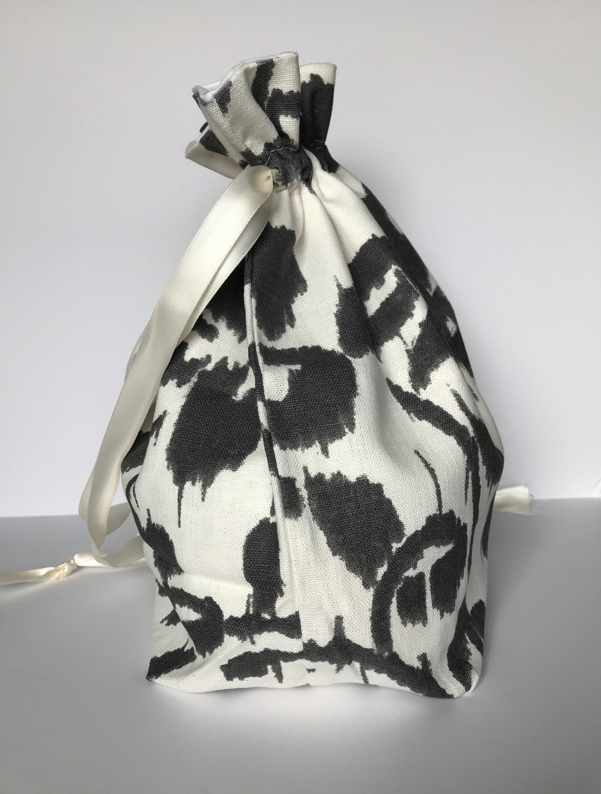 This bag is made with a light canvas outer fabric and 100% cotton lining fabric. Sturdy enough to stand up, yet still squishy to toss in your on-the-go tote. Drawstring closure made with ribbon glides through fabric smoothly.