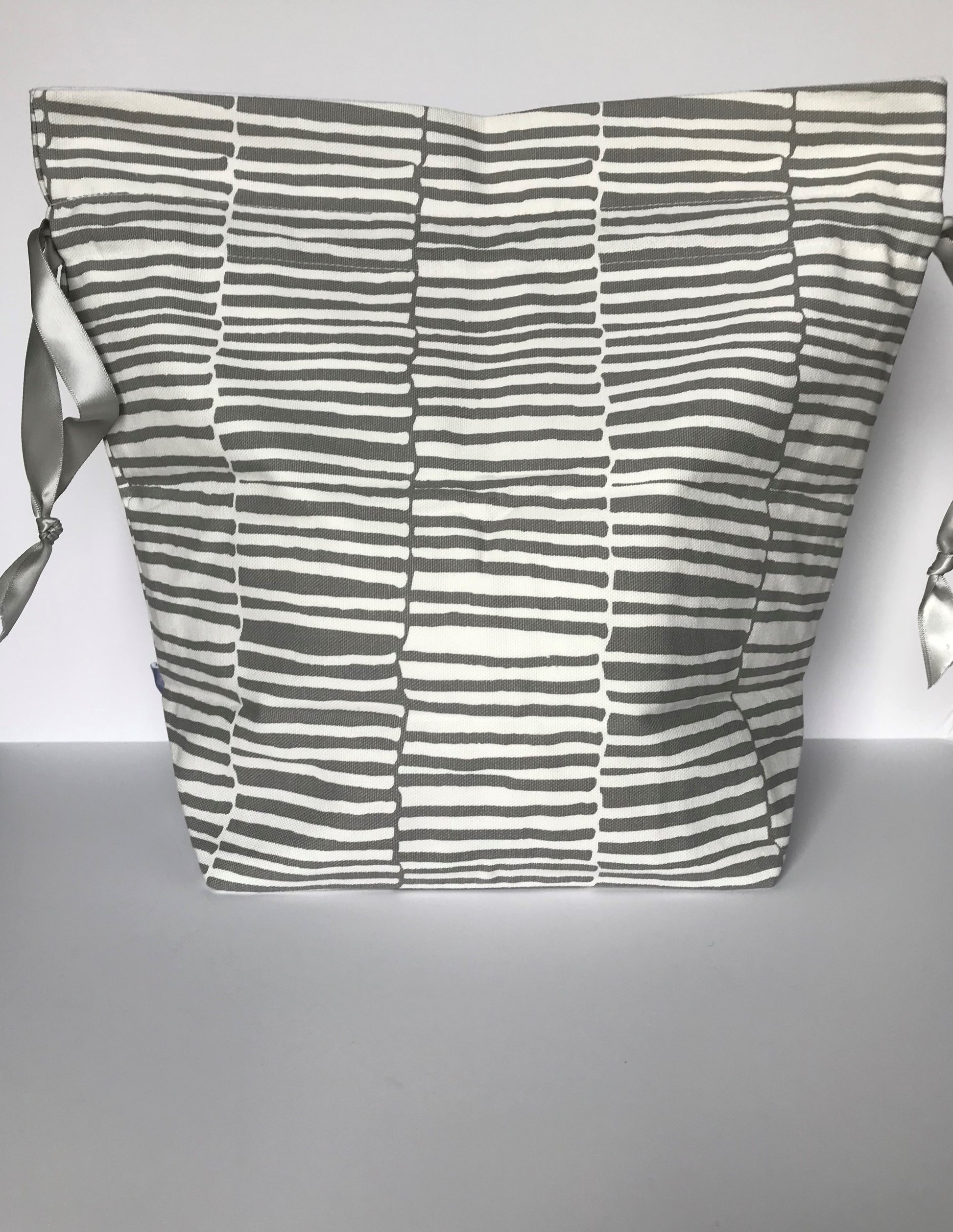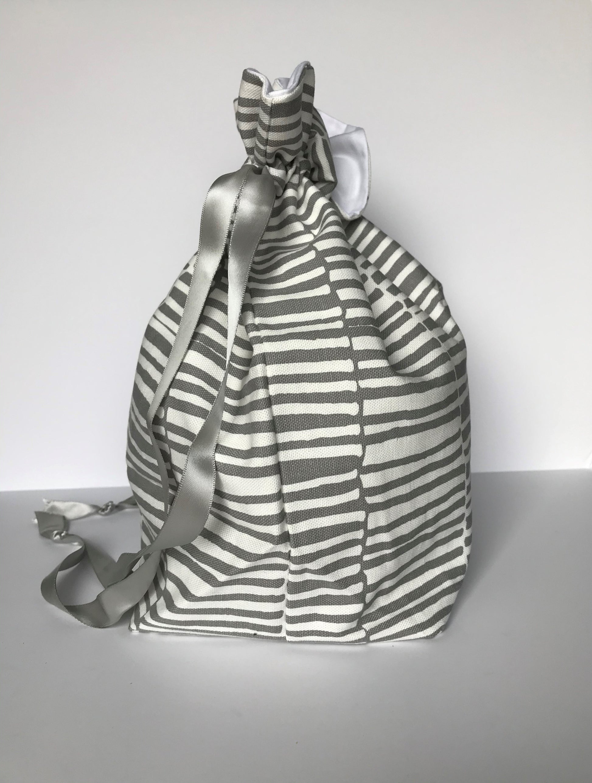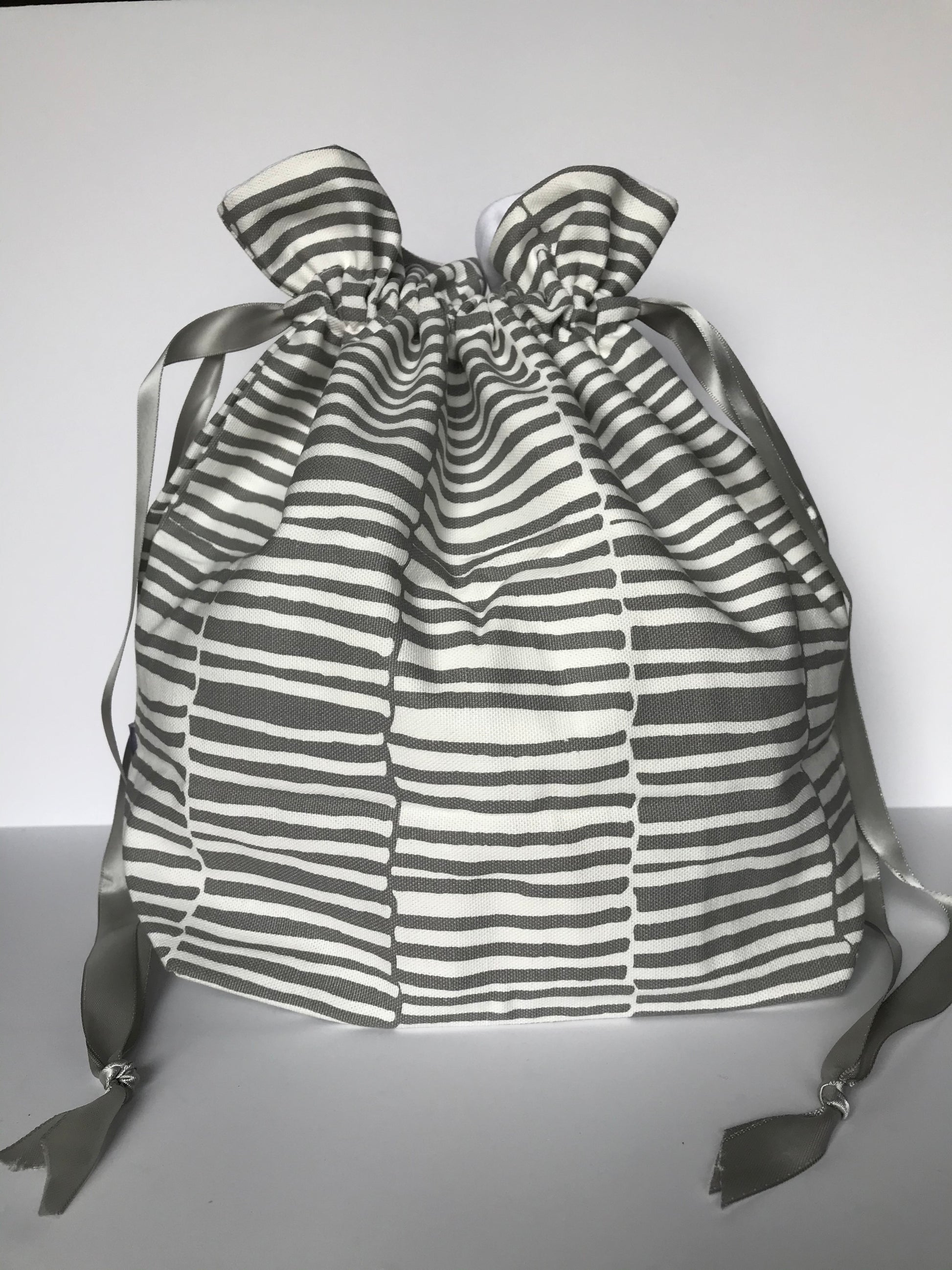 This bag is made with a light canvas outer fabric and 100% cotton lining fabric. Sturdy enough to stand up, yet still squishy to toss in your on-the-go tote. Drawstring closure made with ribbon glides through fabric smoothly.