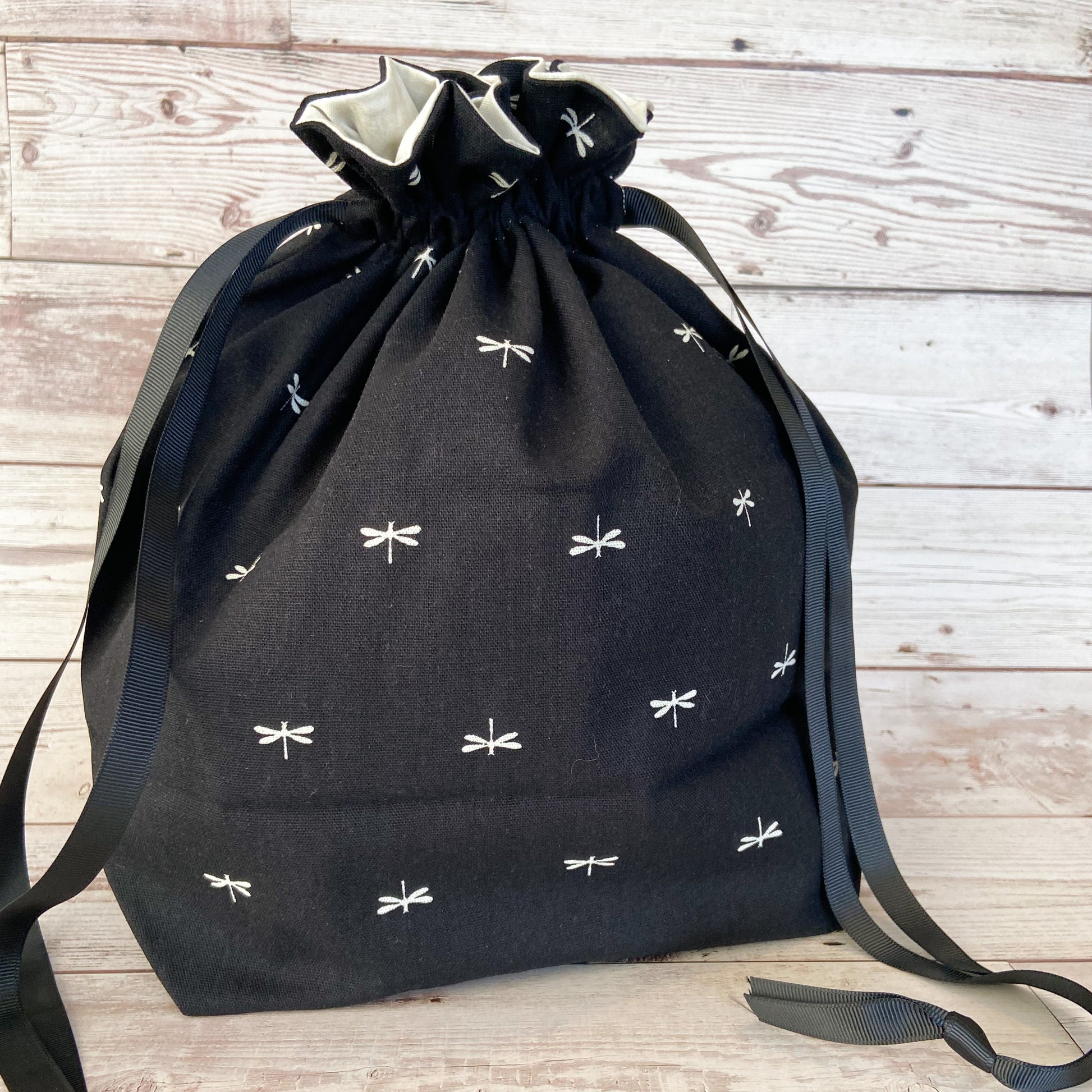 This bag is made with a light canvas outer fabric and 100% cotton lining fabric. Sturdy enough to stand up, yet still squishy to toss in your on-the-go tote. Drawstring closure made with ribbon glides through fabric smoothly.