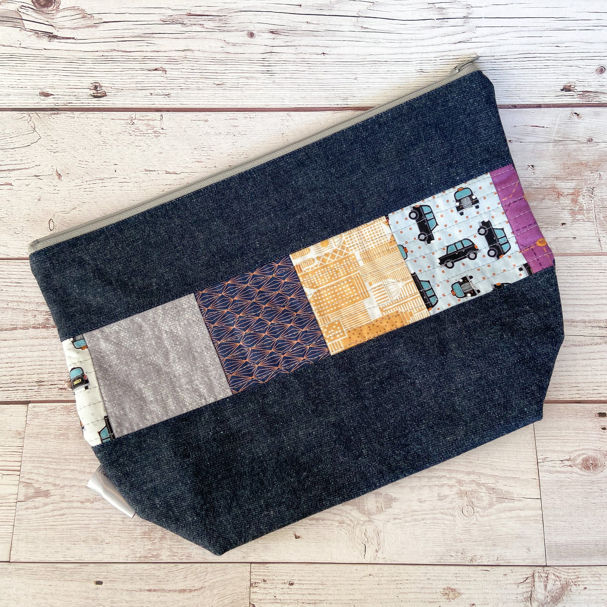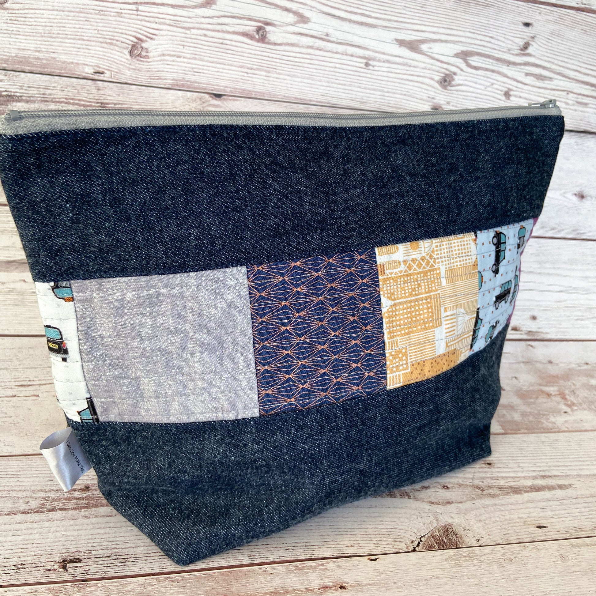 Large zippered project bag perfect for shawls, scarves or light sweater projects. This bag is made with a new denim outer fabric and 100% cotton lining fabric. Decorated with a quilted fabric panel on one side of the bag.