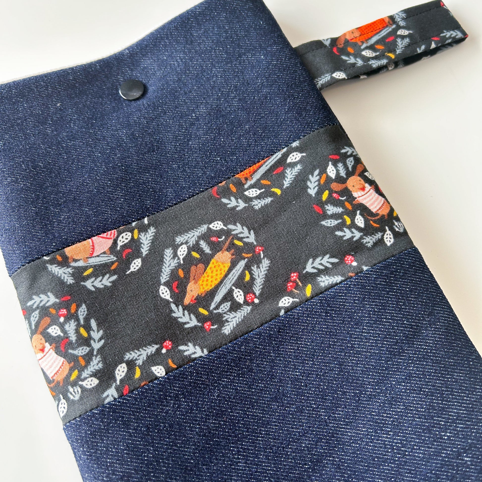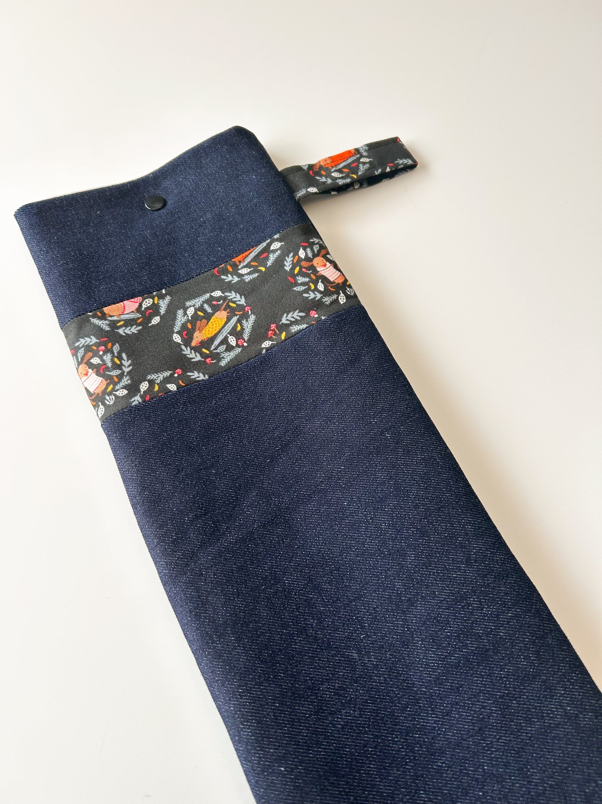 These scroll rod/swift holders are made with new denim and 100% cotton fabric. There is one layer of fusible interfacing to provide protection. Each come with a handle to hang on a hook or knob to keep it safe. A coordinating snap is added to allow you to travel with your project contained.