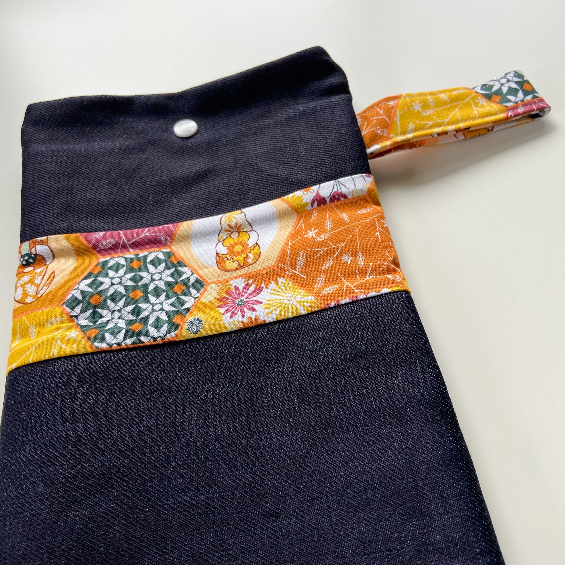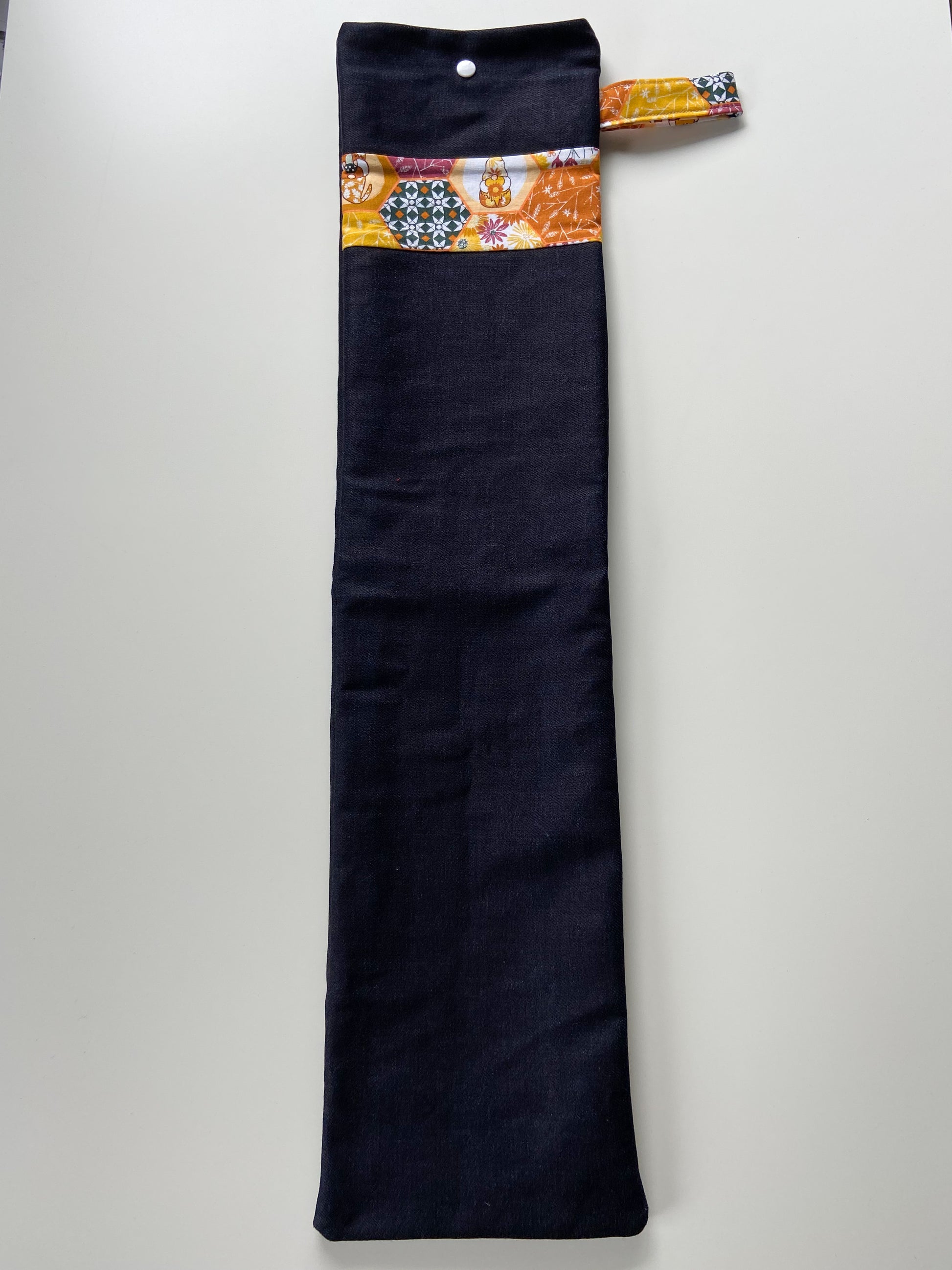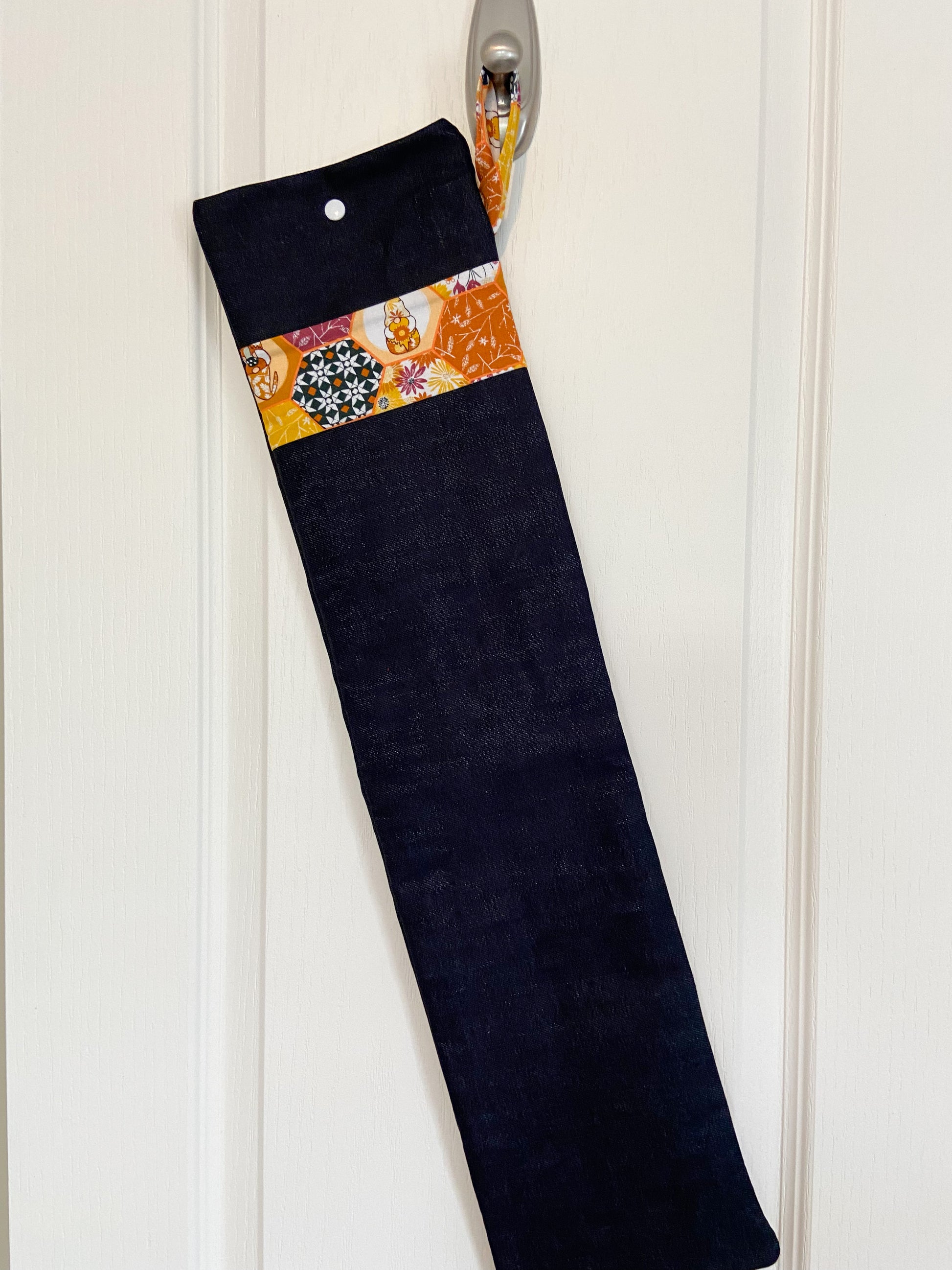 These scroll rod/swift holders are made with new denim and 100% cotton fabric. There is one layer of fusible interfacing to provide protection. Each come with a handle to hang on a hook or knob to keep it safe. A coordinating snap is added to allow you to travel with your project contained.