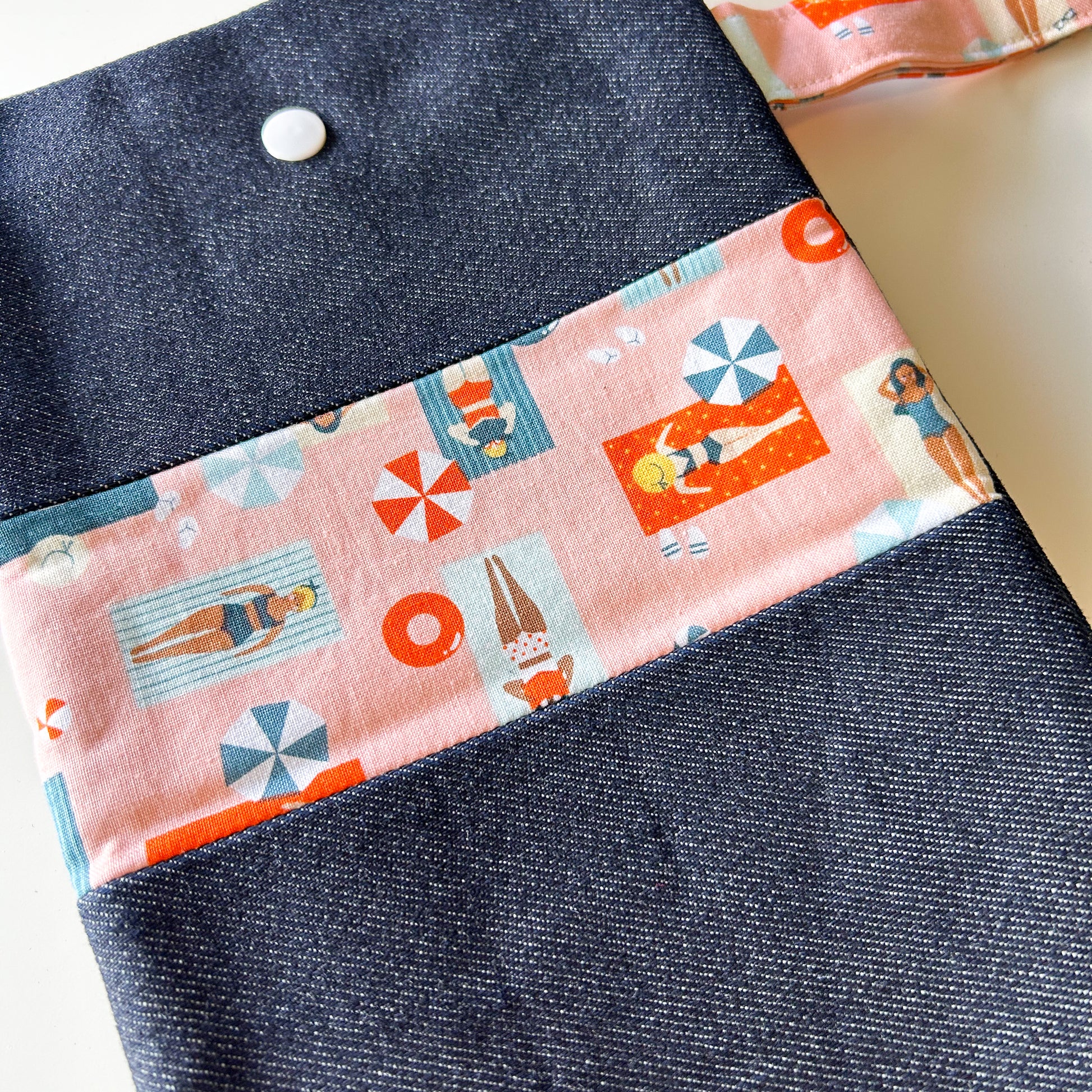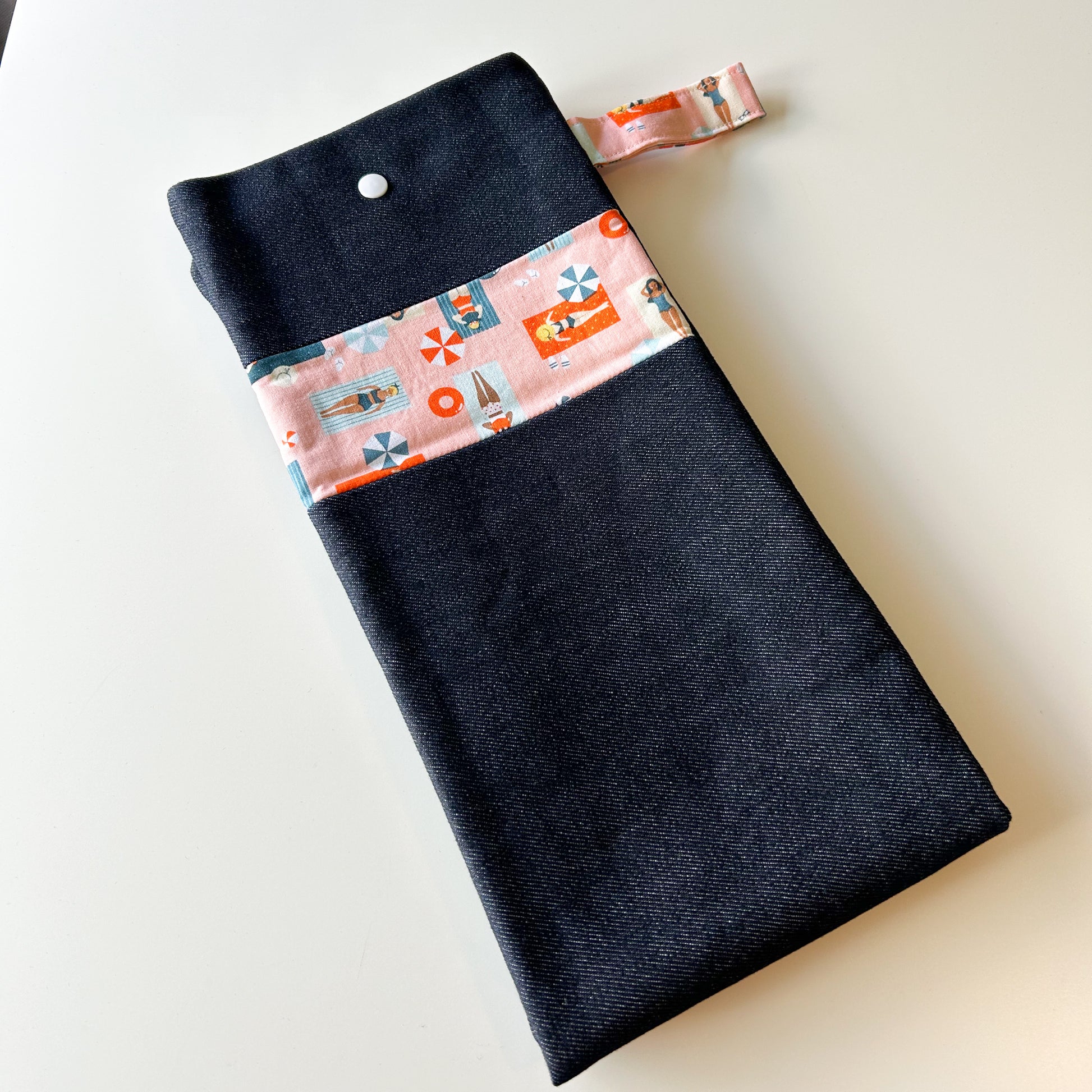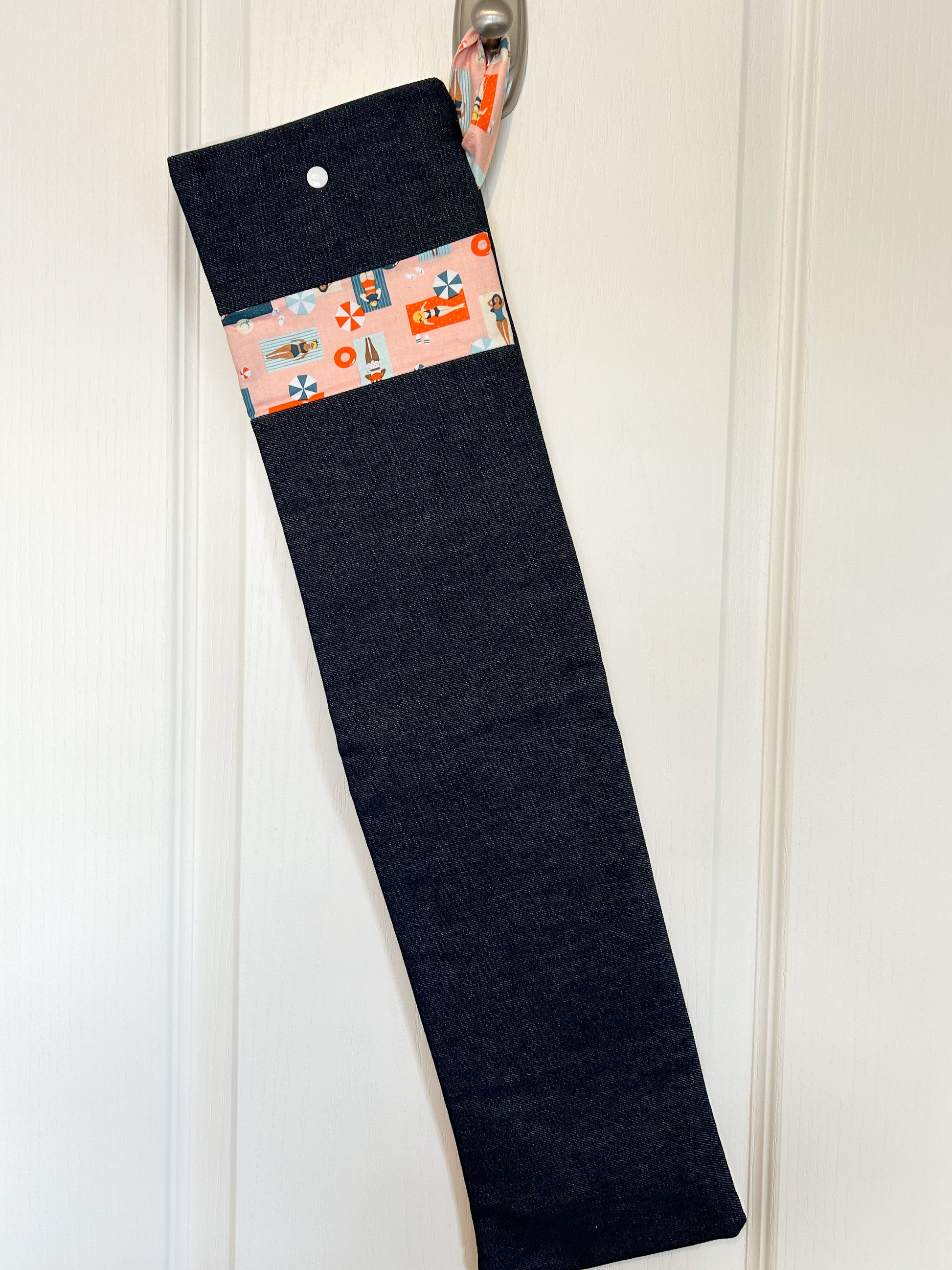These scroll rod/swift holders are made with new denim and 100% cotton fabric. There is one layer of fusible interfacing to provide protection. Each come with a handle to hang on a hook or knob to keep it safe. A coordinating snap is added to allow you to travel with your project contained.