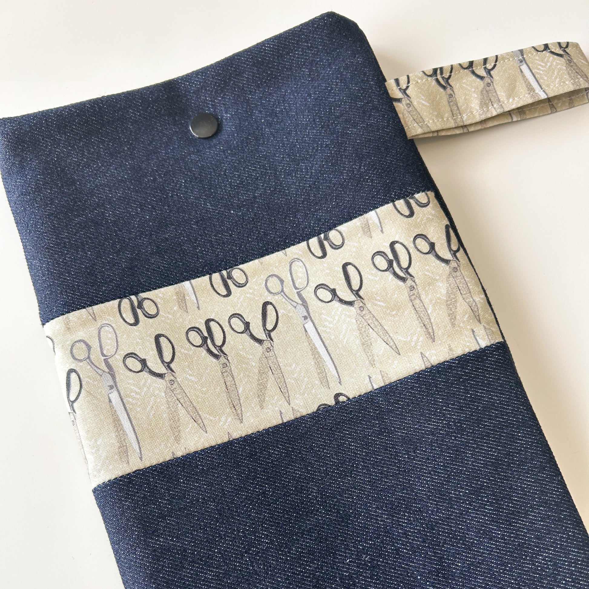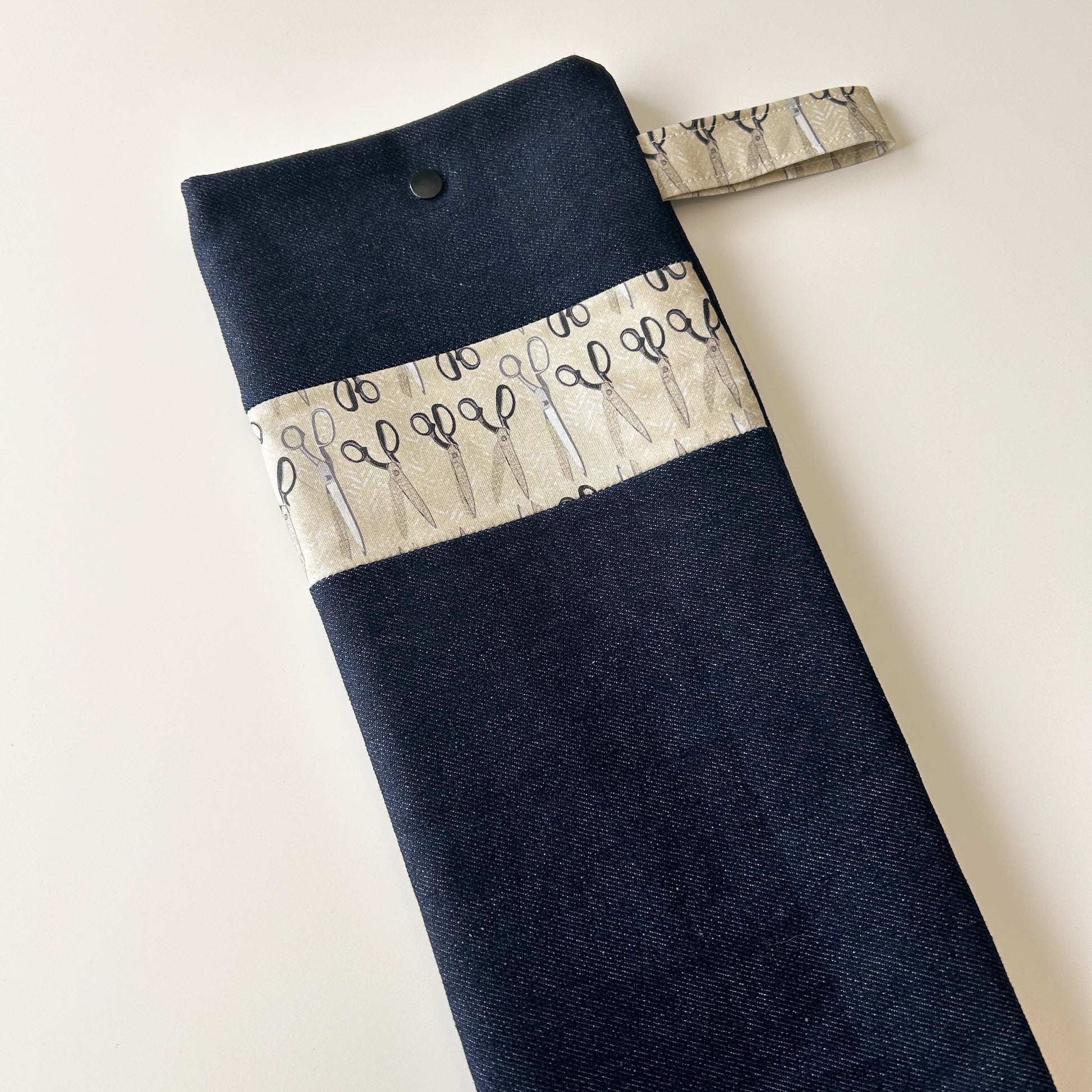 These scroll rod/swift holders are made with new denim and 100% cotton fabric. There is one layer of fusible interfacing to provide protection. Each come with a handle to hang on a hook or knob to keep it safe. A coordinating snap is added to allow you to travel with your project contained.