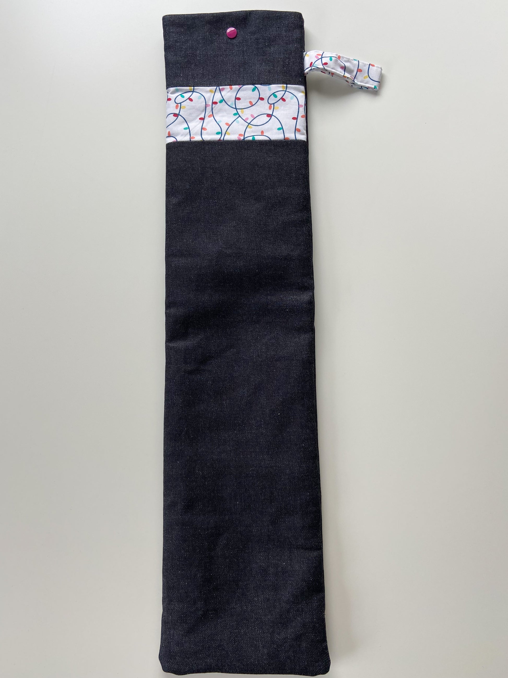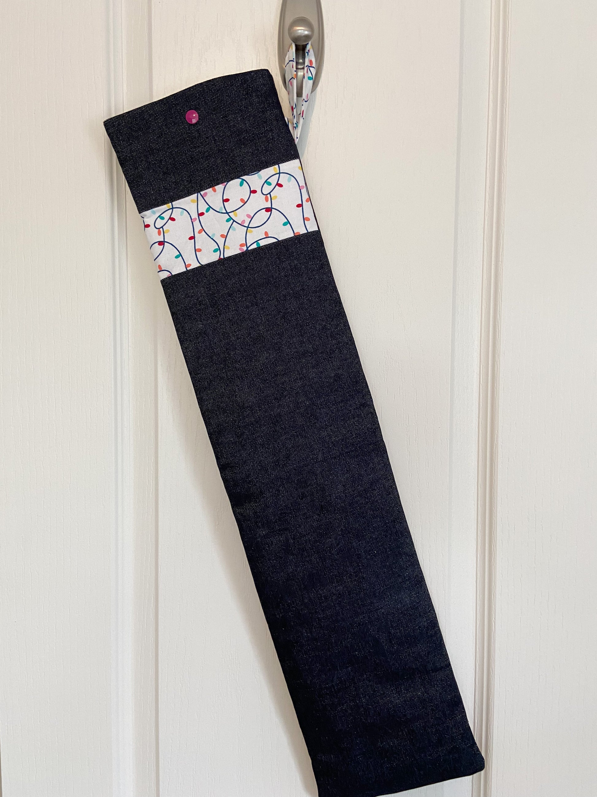 These scroll rod/swift holders are made with new denim and 100% cotton fabric. There is one layer of fusible interfacing to provide protection. Each come with a handle to hang on a hook or knob to keep it safe. A coordinating snap is added to allow you to travel with your project contained.