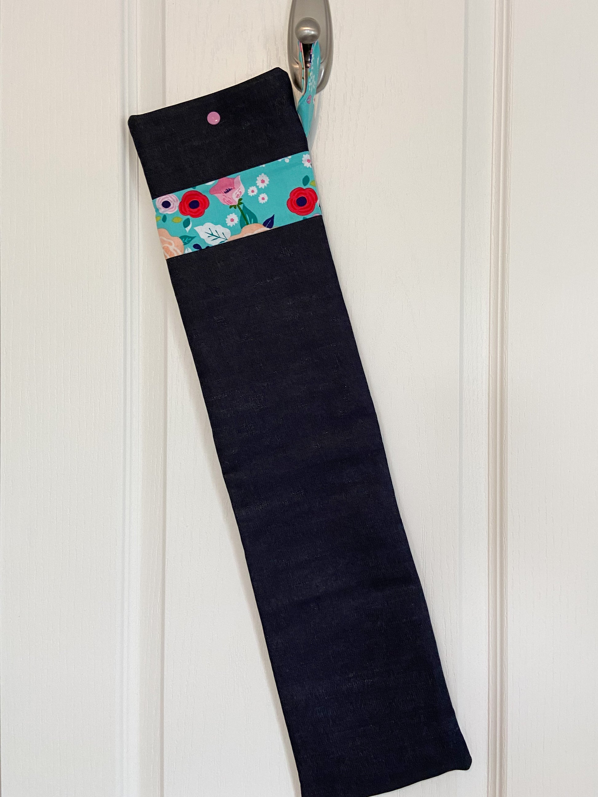These scroll rod/swift holders are made with new denim and 100% cotton fabric. There is one layer of fusible interfacing to provide protection. Each come with a handle to hang on a hook or knob to keep it safe. A coordinating snap is added to allow you to travel with your project contained.