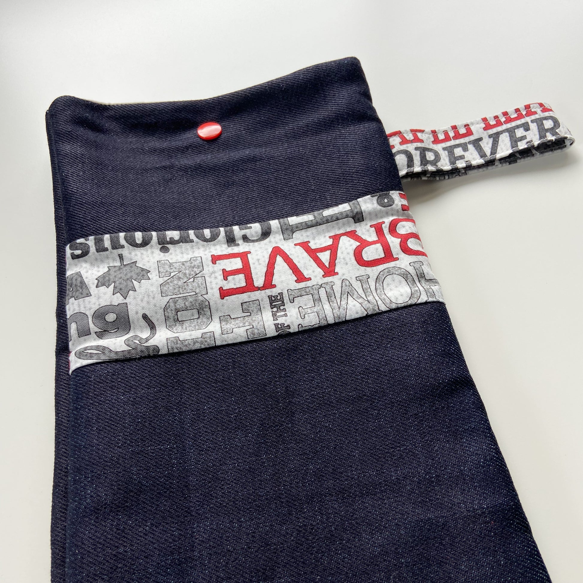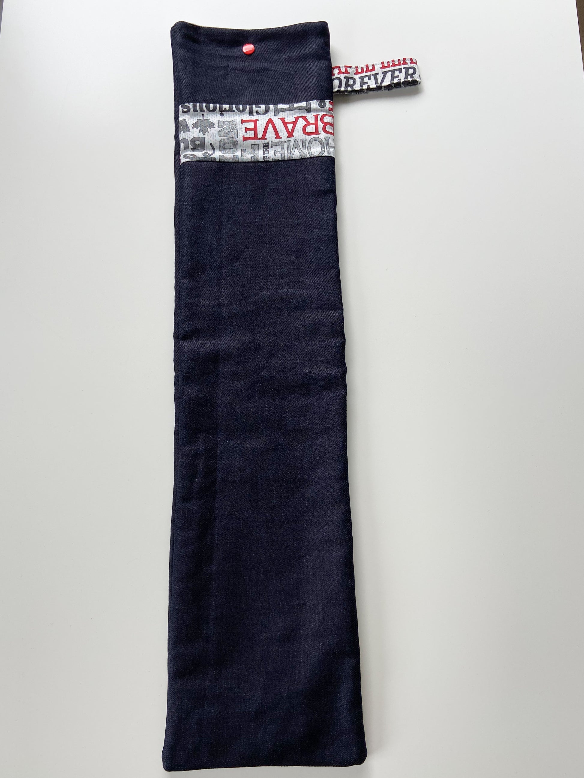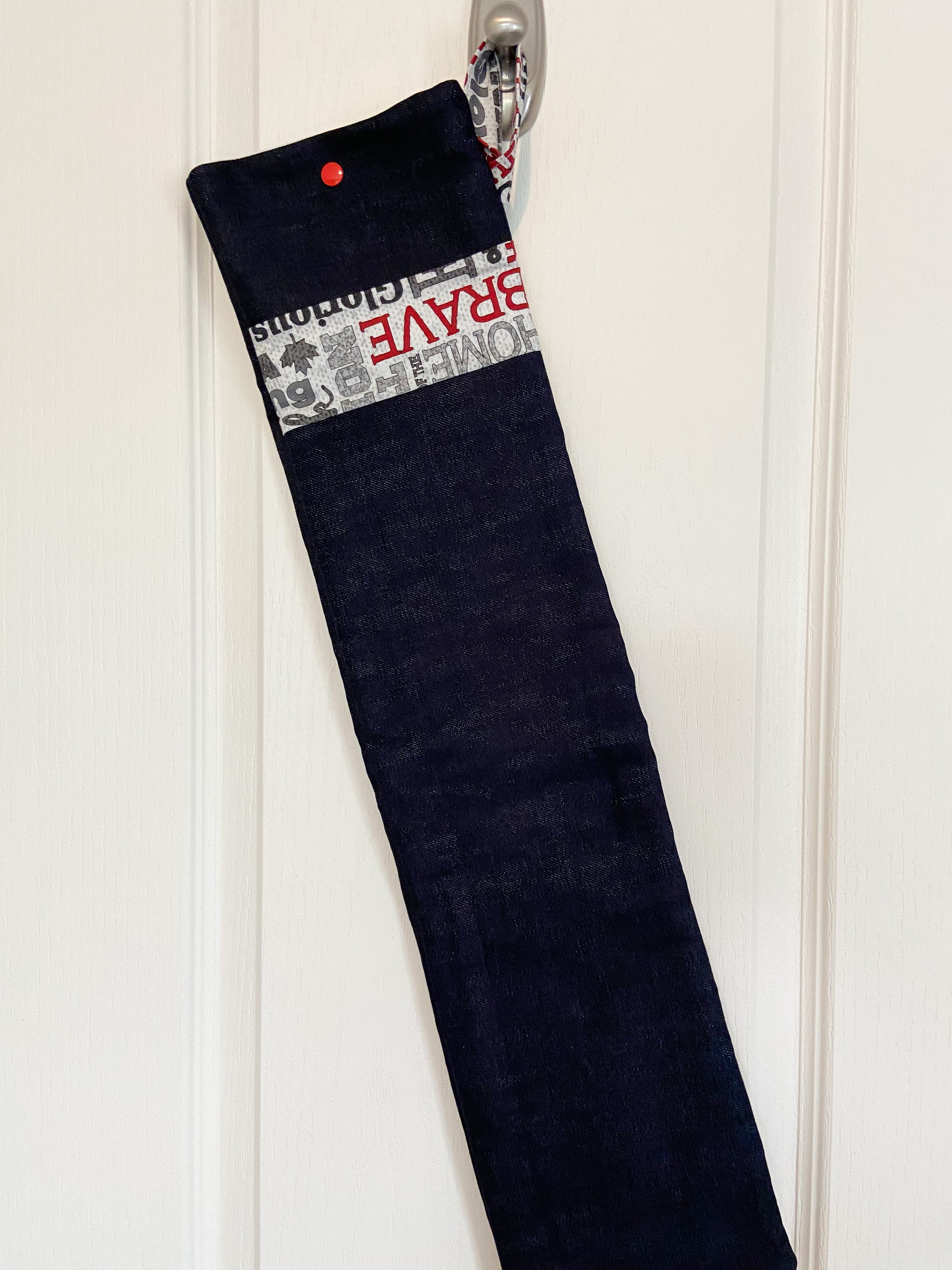 These scroll rod/swift holders are made with new denim and 100% cotton fabric. There is one layer of fusible interfacing to provide protection. Each come with a handle to hang on a hook or knob to keep it safe. A coordinating snap is added to allow you to travel with your project contained.