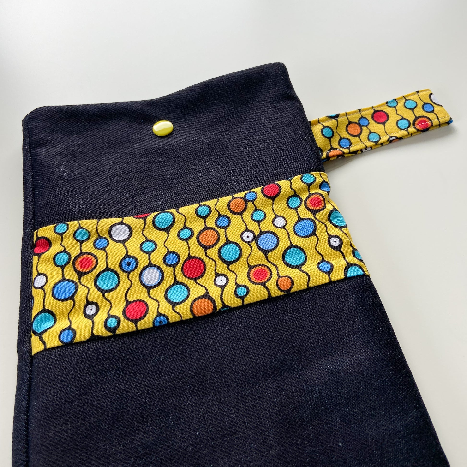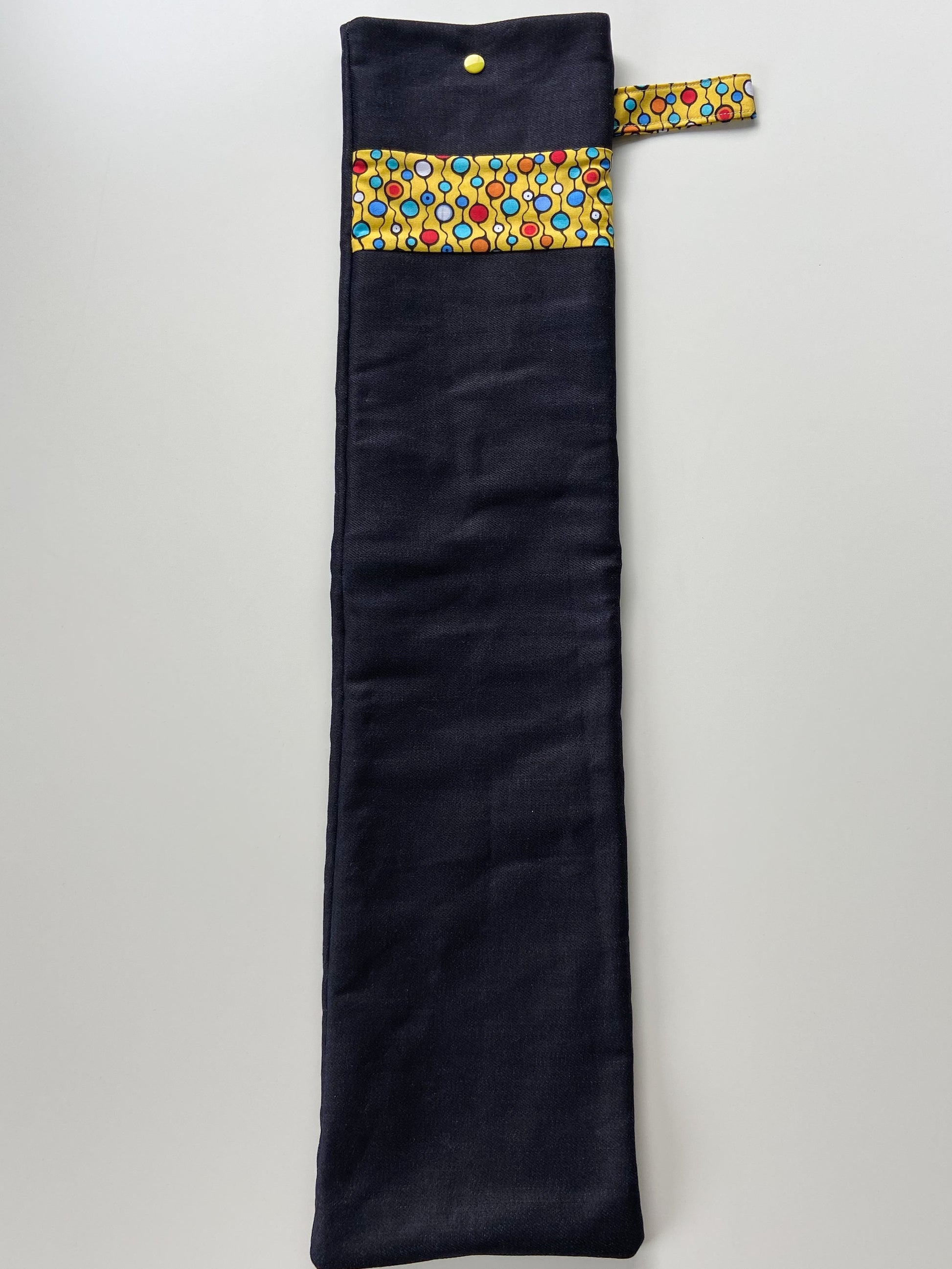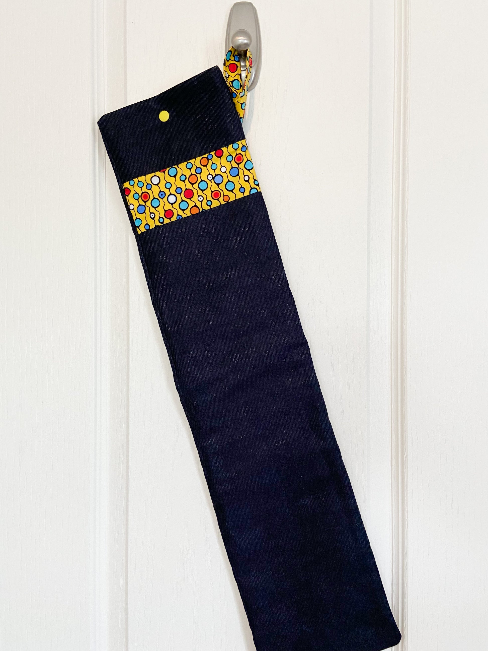 These scroll rod/swift holders are made with new denim and 100% cotton fabric. There is one layer of fusible interfacing to provide protection. Each come with a handle to hang on a hook or knob to keep it safe. A coordinating snap is added to allow you to travel with your project contained.
