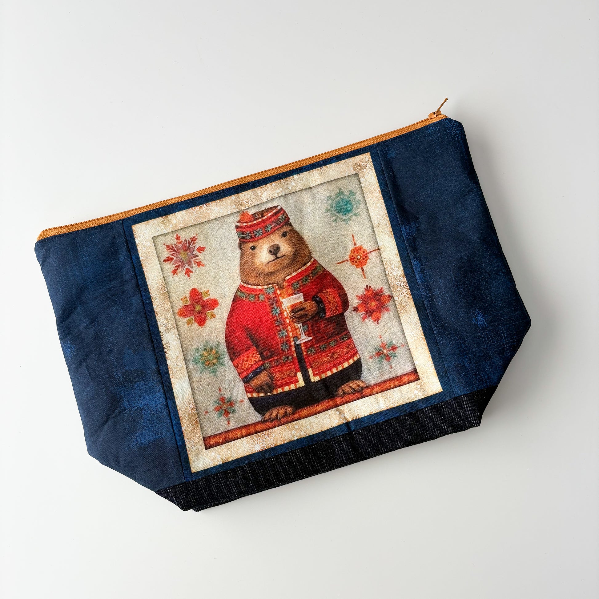 Small zippered project bag perfect for socks, hats or mitten and shawl projects. This bag is made with a new denim outer fabric and 100% cotton lining fabric. Decorated with a quilted fabric panel on one side of the bag.