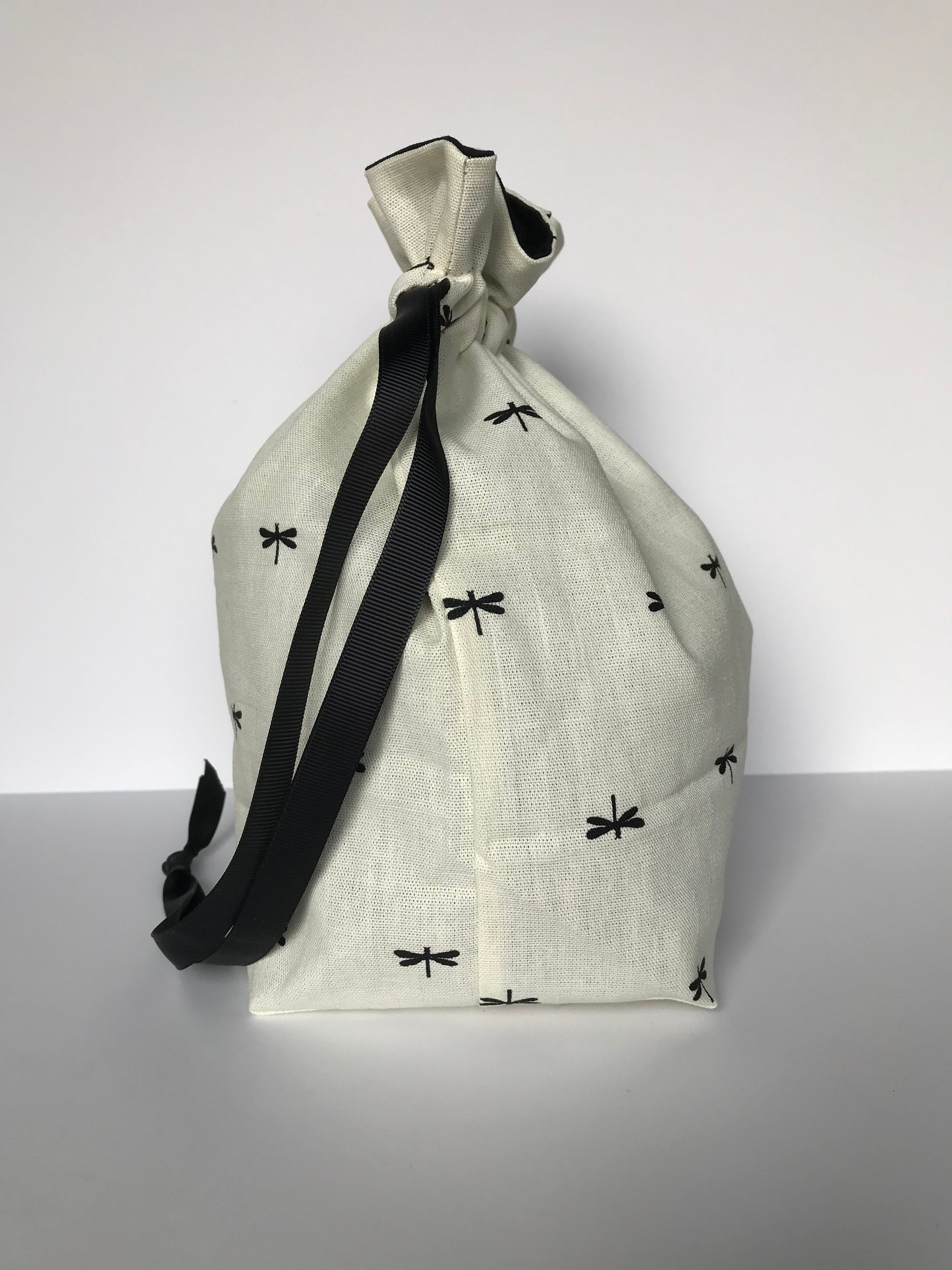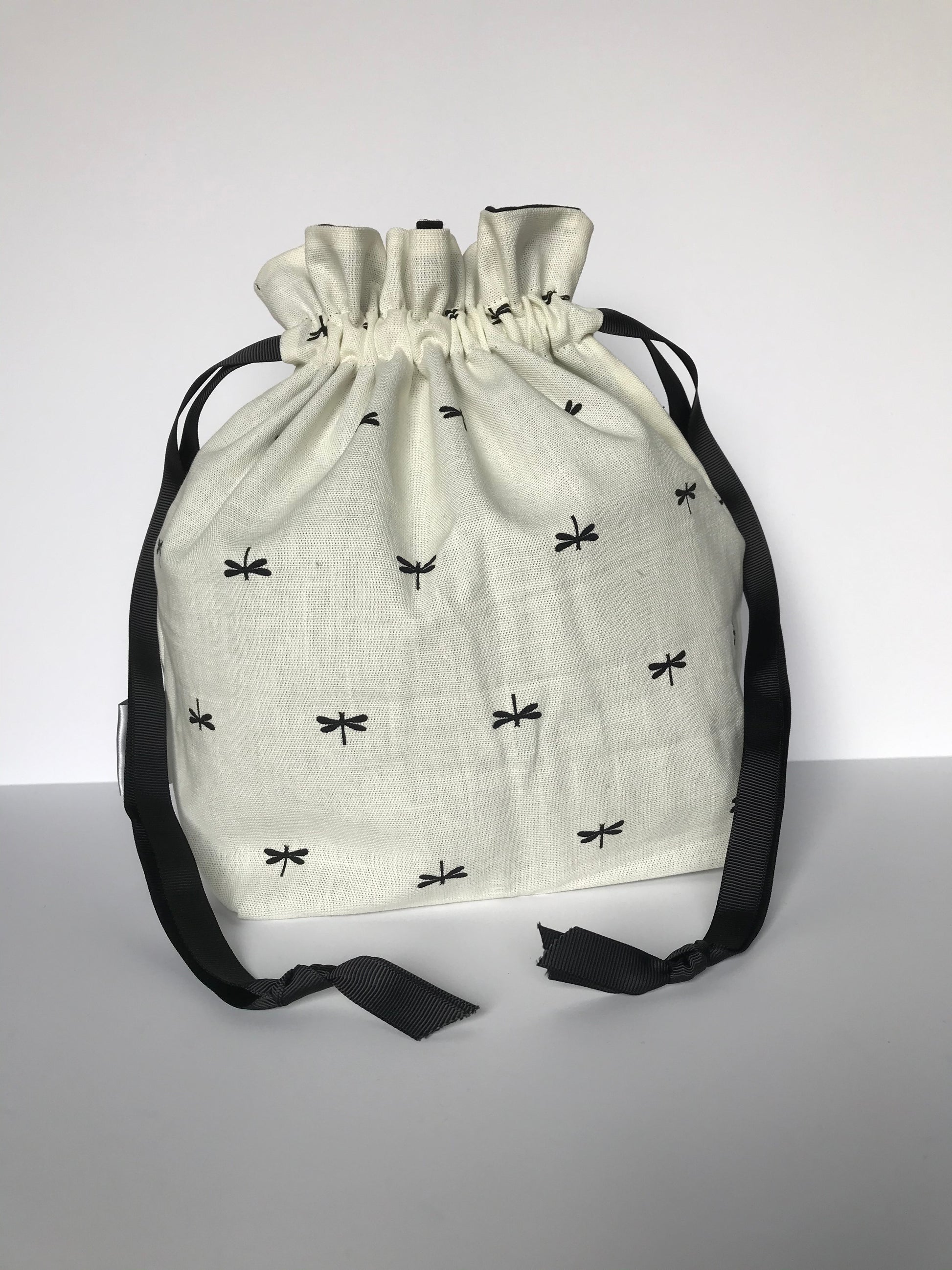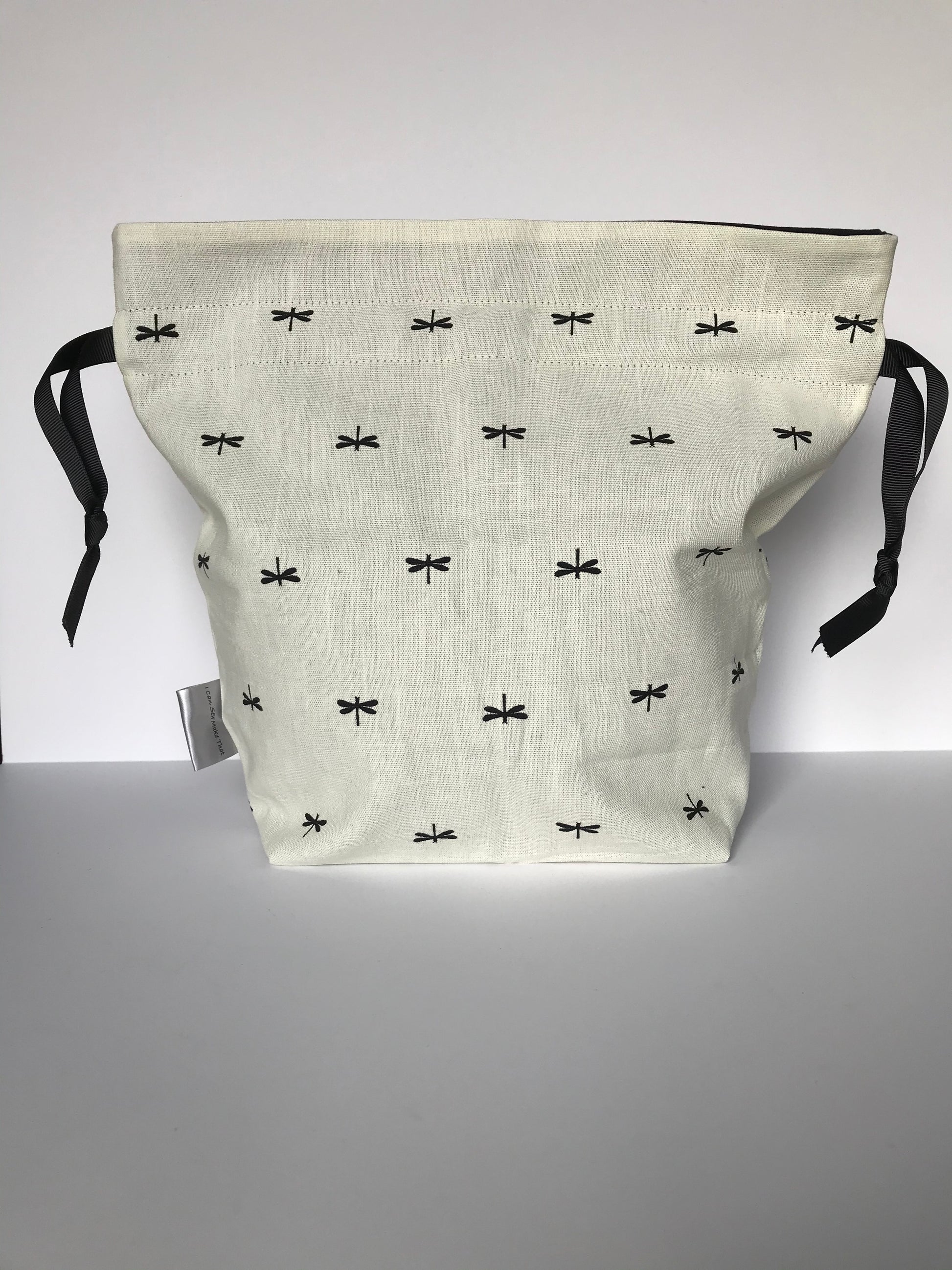 Small drawstring bag perfect for socks, mittens or other small projects. This bag is made with a light canvas outer fabric and 100% cotton lining fabric. Sturdy enough to stand up, yet still squishy to toss in your on-the-go tote. Drawstring closure made with ribbon glides through fabric smoothly.
