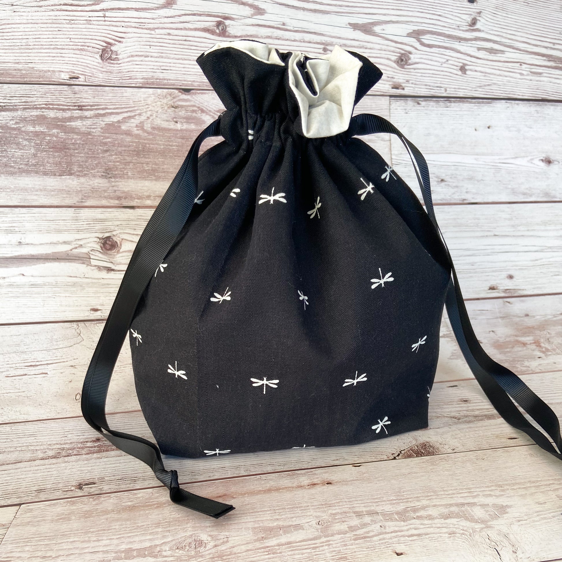 Small drawstring bag perfect for socks, mittens or other small projects. This bag is made with a light canvas outer fabric and 100% cotton lining fabric. Sturdy enough to stand up, yet still squishy to toss in your on-the-go tote. Drawstring closure made with ribbon glides through fabric smoothly.