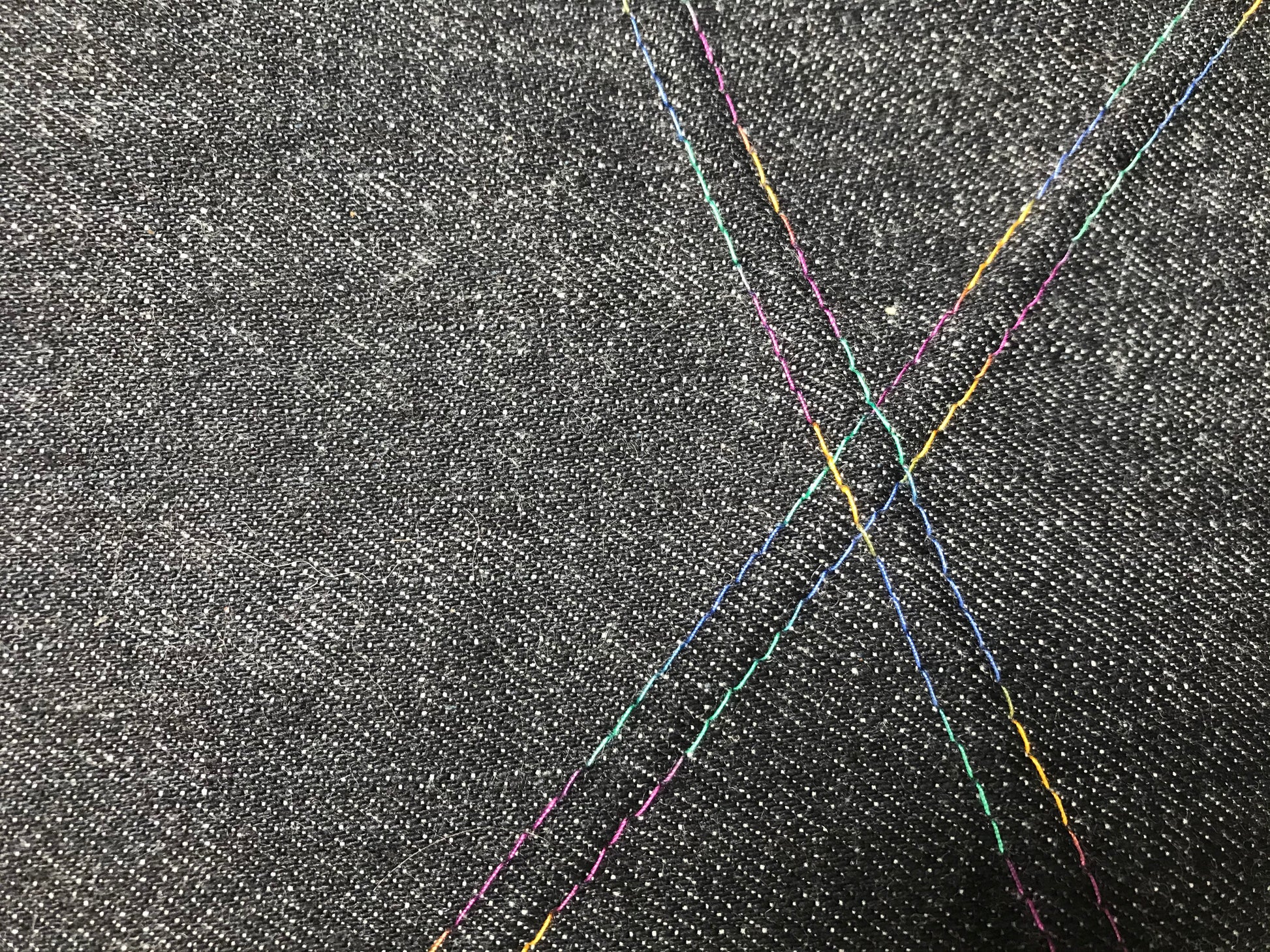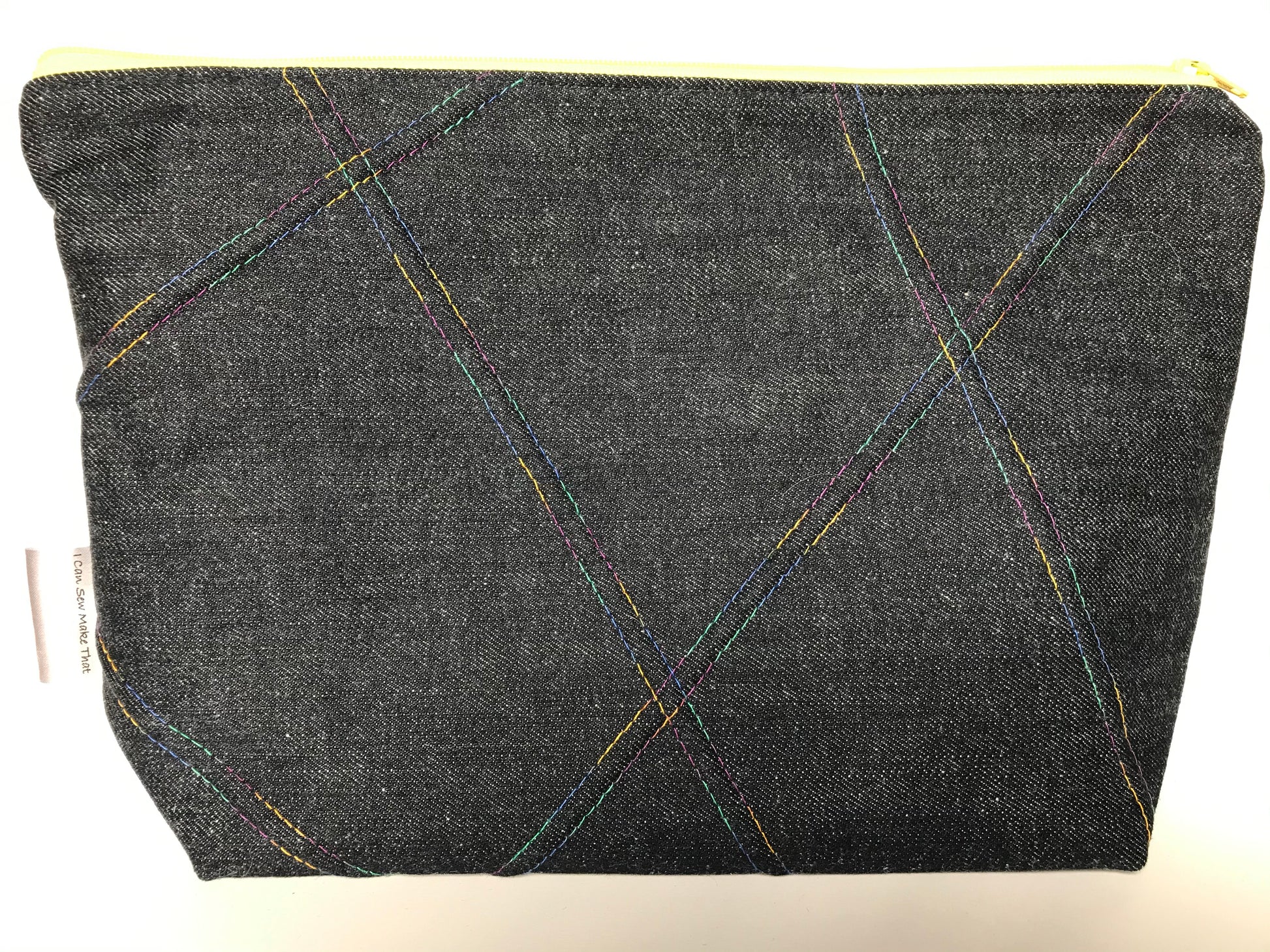 Small zippered project bag perfect for socks, hats or mitten and shawl projects. This bag is made with a new denim outer fabric and 100% cotton lining fabric. Decorated with a variegated thread in random pattern on one side of the bag.