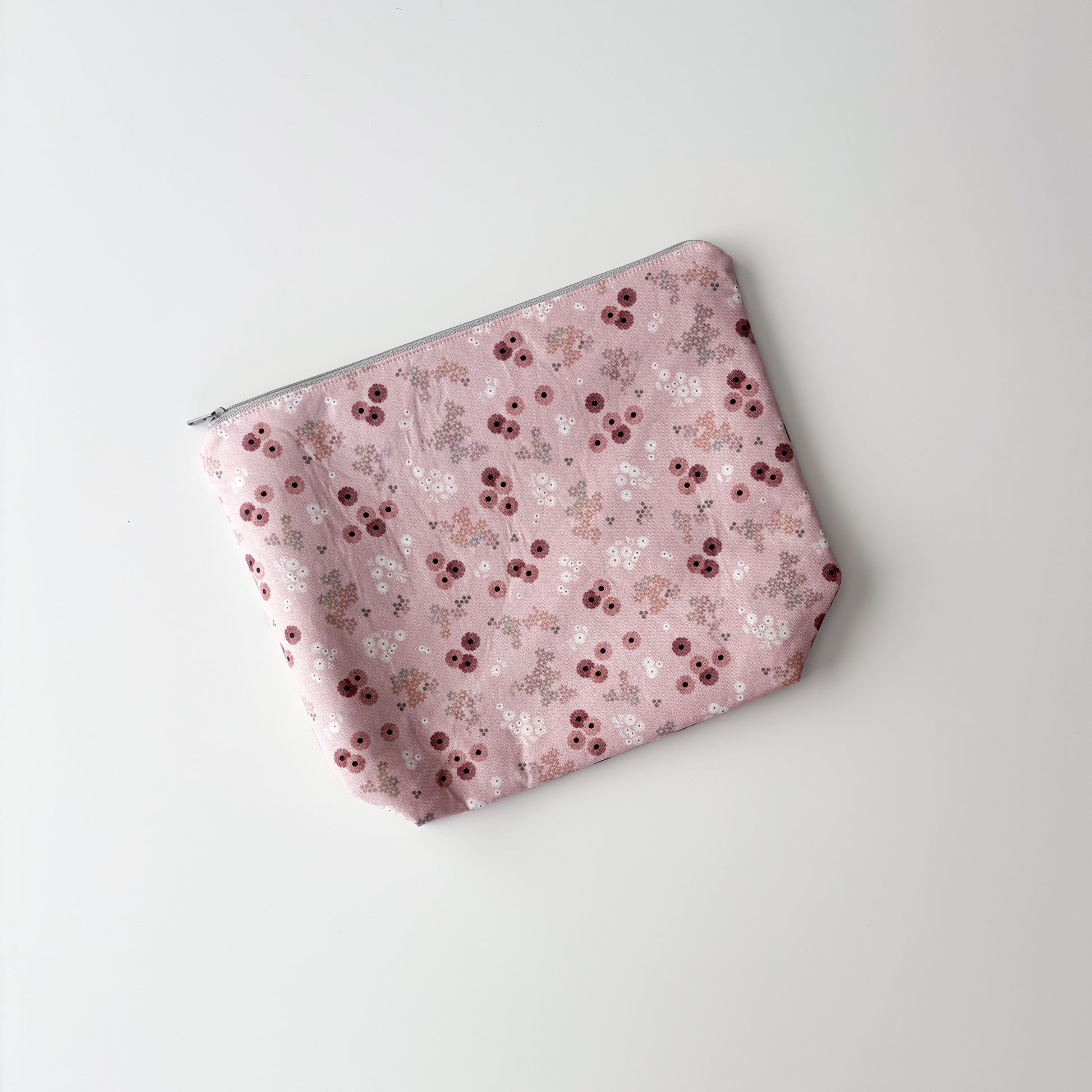 Roll down the top portion of bag and use to work your project from. Made with new 100% cotton, nylon zipper and fusible fleece for added padding.