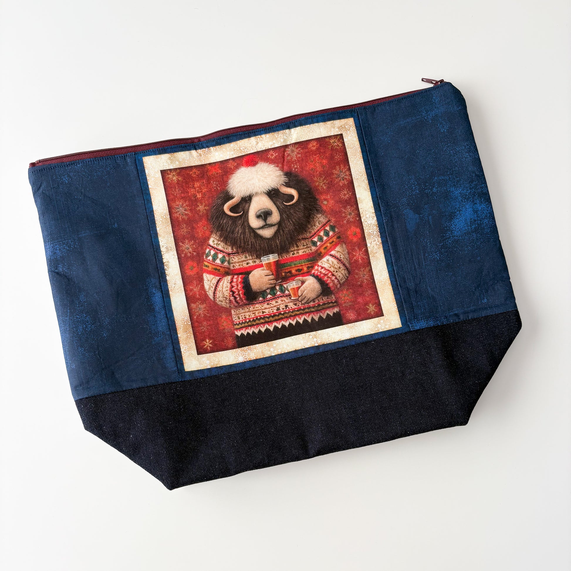 Extra Large zippered project bag perfect for sweater, blanket or shawl projects. This bag is made with a new denim outer fabric and 100% cotton lining fabric. Decorated with a quilted fabric panel on one side of the bag.